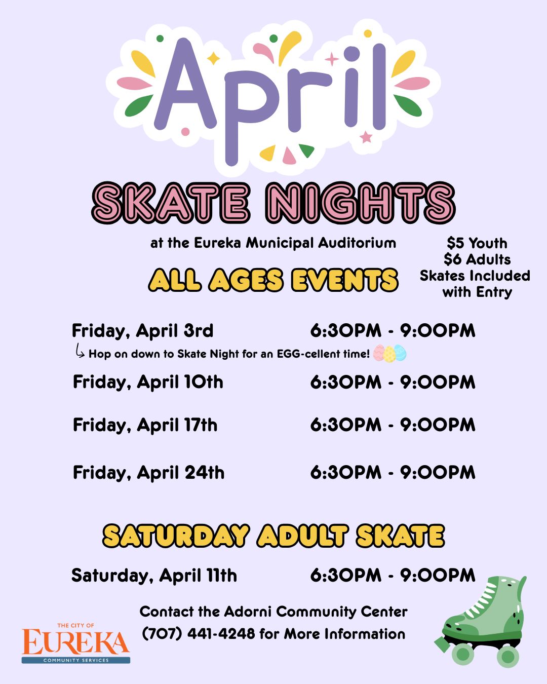 - Friday, April 3rd 6:30PM-9PM ALL AGES (Hop on down to Skate Night for an EGG-cellent time!)
