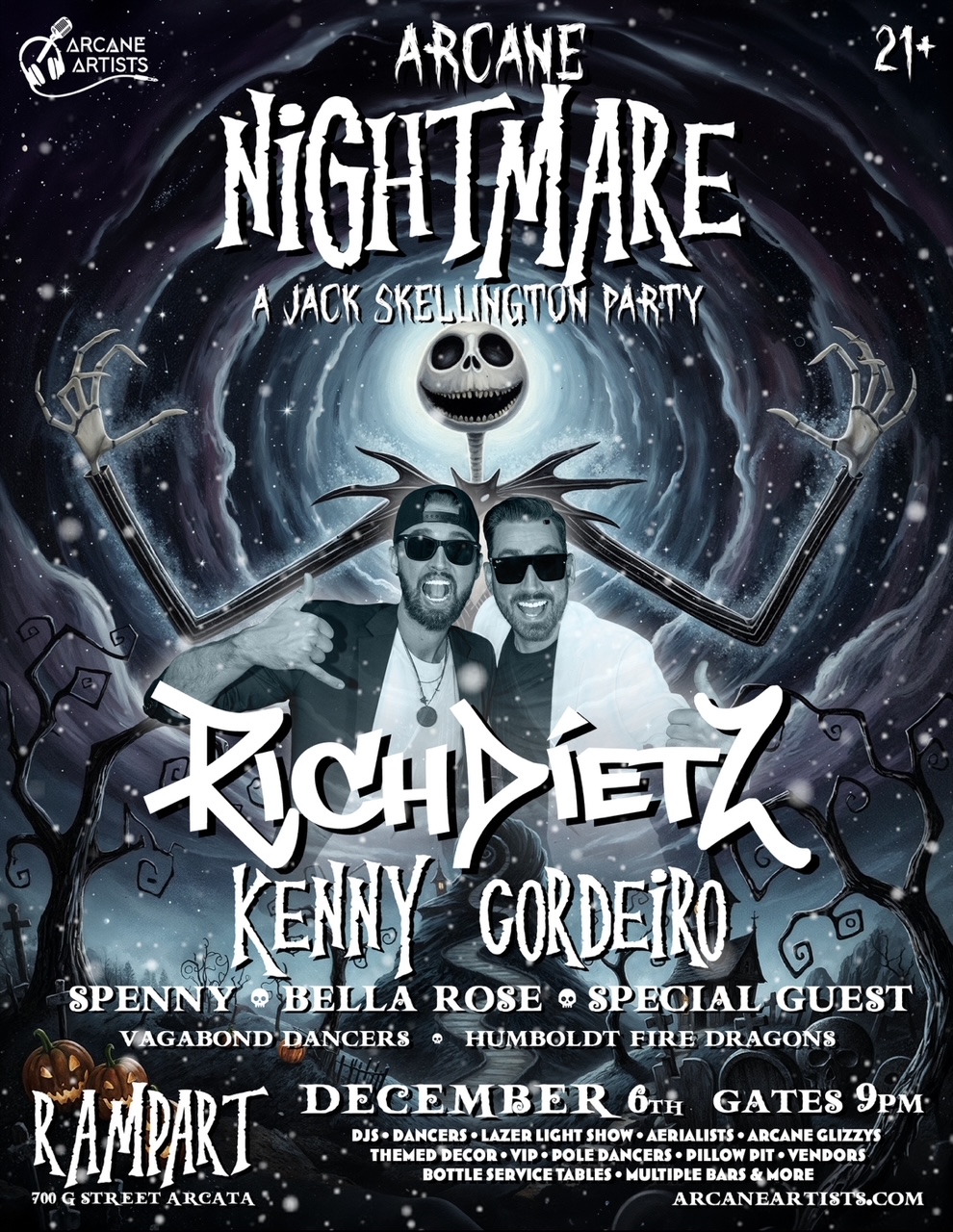 Are you preparing for Christmas, but still missing Halloween?… US TOO! We are so excited to announce the 4th annual ARCANE NIGHTMARE, where you can get the best of both worlds. Come immerse yourself in this Nightmare Before Christmas. We are bringing none other than the sensational EDM duo Rich DietZ, who have gained global recognition for their unique sound, blending high-octane bass-house and peak-time tech-house. You might recognize them from their hit songs “White Claw Song” or “Work” with Proppa, Smith & Soren. Joining the duo is none other than bay area, high energy house producer, KENNY CORDEIRO and amazing tech house artist and Humboldt favorite, SPENNY as well as a secret guest DJ that is not to be missed. We are also bringing the vocal heat with a special performance by BELLA ROSE and the VAGABOND DANCERS! It is time to get into the spirit and express yourself this holiday season as we transform RAMPART into something out of a Tim Burton movie. We have special sets by the Vagabond Dancers, Humboldt Fire Dragons, aerialists, pole performers, and a couple other themed surprises, not to mention amazing specialty hot dogs from ARCANE GLIZZY’S. And of course we have special goodies for all the VIP guests sponsored by Express Smokeshop.