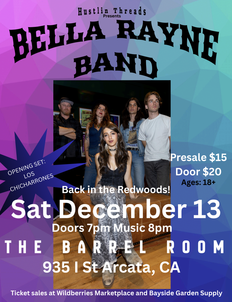 Bella Rayne is and 18 years self taught guitar phenomenon from Mendocino, California who is quickly making a name for herself in the music industry. Her love for the Grateful Dead, psychedelic rock, Souther Rock, 90’s grunge, and even a little bluegrass has been distilled into her own fresh approach. She recently formed her own band, a high energy guitar driven ensemble with a lineup of all star musicians that bring jam band twists to Southern Rock classics….plus some originals!!!