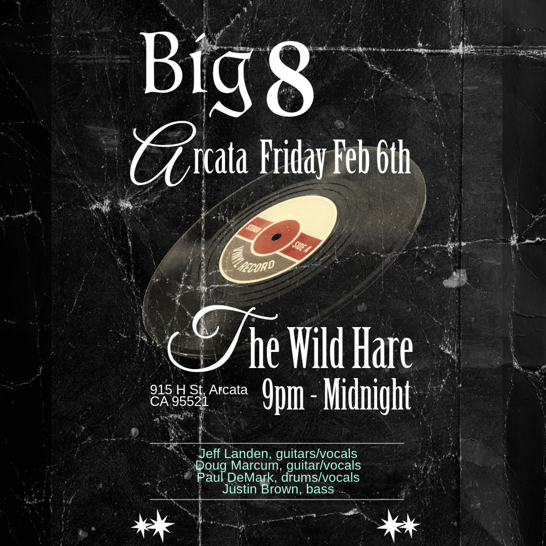 Join the gang at The Wild Hare on Friday, February 6th for BIG 8 featuring Jeff Landen, guitar/vocals, Doug Marcum, guitar/vocals, Paul DeMark, drums/vocals and Justin Brown, bass