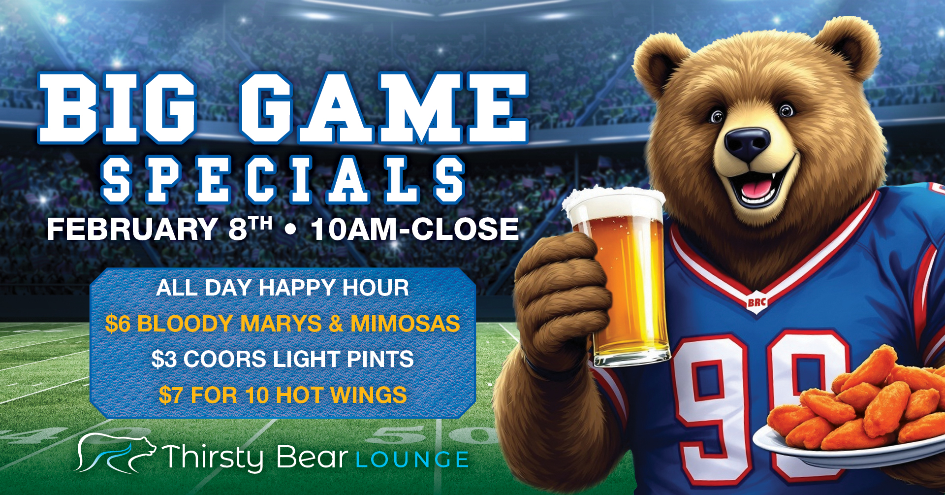 Join us in the Thirsty Bear Lounge for the ultimate Big Game watch party! Watch all the action while enjoying all-day happy hour, featuring $6 Bloody Marys and mimosas, $3 Coors Light pints, and $7 for 10 hot wings.