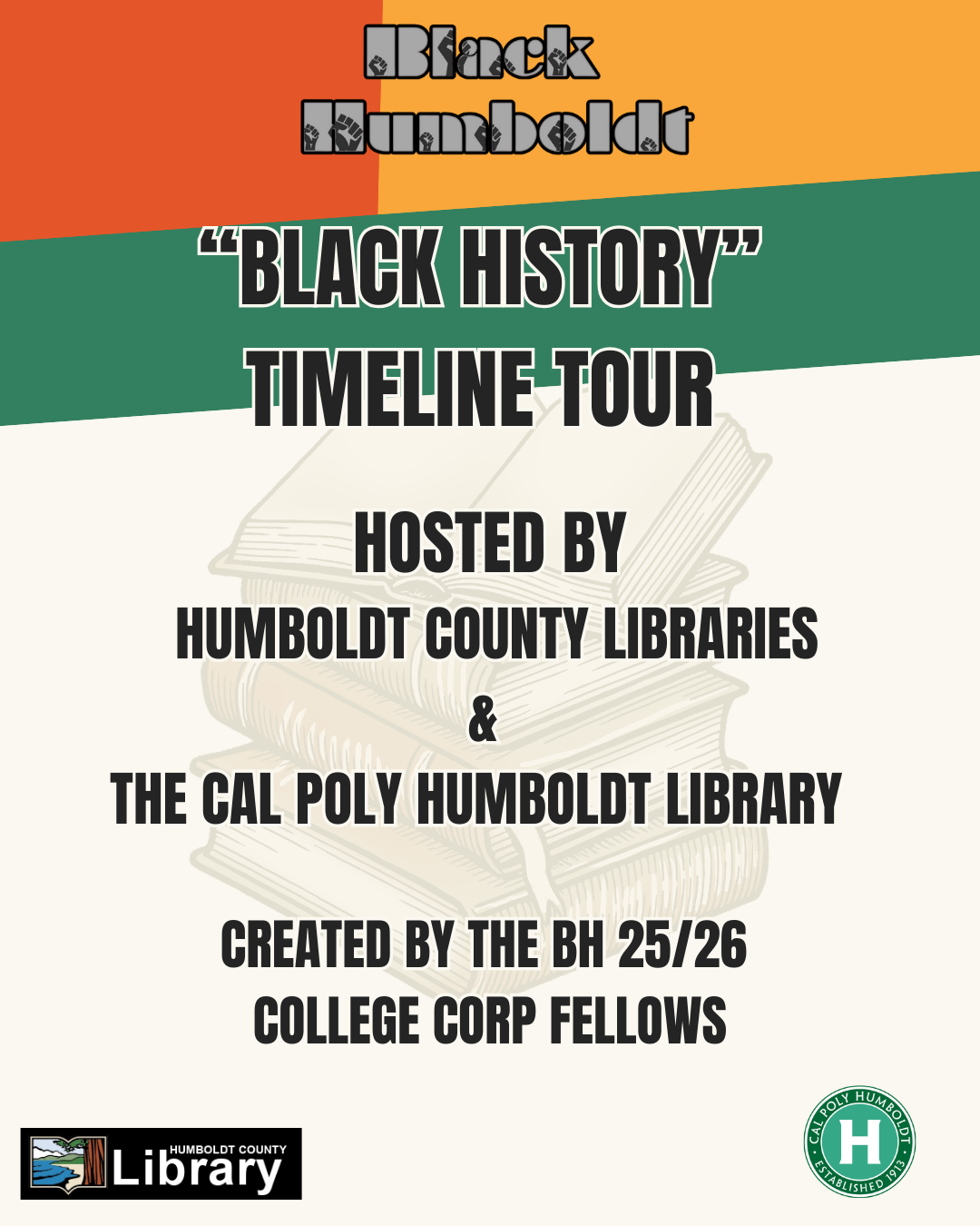 Come check out our Black Liberation Month installation; Black History Timeline Tour, created by our Black Humboldt 2025/2026 College Corp Fellows. Hosted across Humboldt County Libraries as well as at the Cal Poly Humboldt Library. This instillation is free to visit and family friendly.