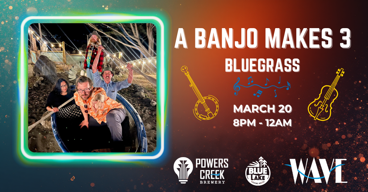 A Banjo Makes 3 is keeping traditional bluegrass alive with the sounds of Jimmy Martin, Flatt & Scruggs, and Bill Monroe, to name a few. A Humboldt-based 4-piece band featuring Charlie Sleep on guitar and vocals, Doc Wolgum pickin’ on the mandolin and singing, Kevin Ralston on banjo, and Larissa Sleep drives the bottom end on upright bass. Come see why they’ve been playing to big crowds all over Northern and Southern Humboldt!