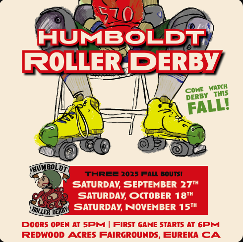 Bruise News - Humboldt Roller Derby 2025. We got some double-headers for you! Come Watch roller derby this Fall! Saturday, November 15!