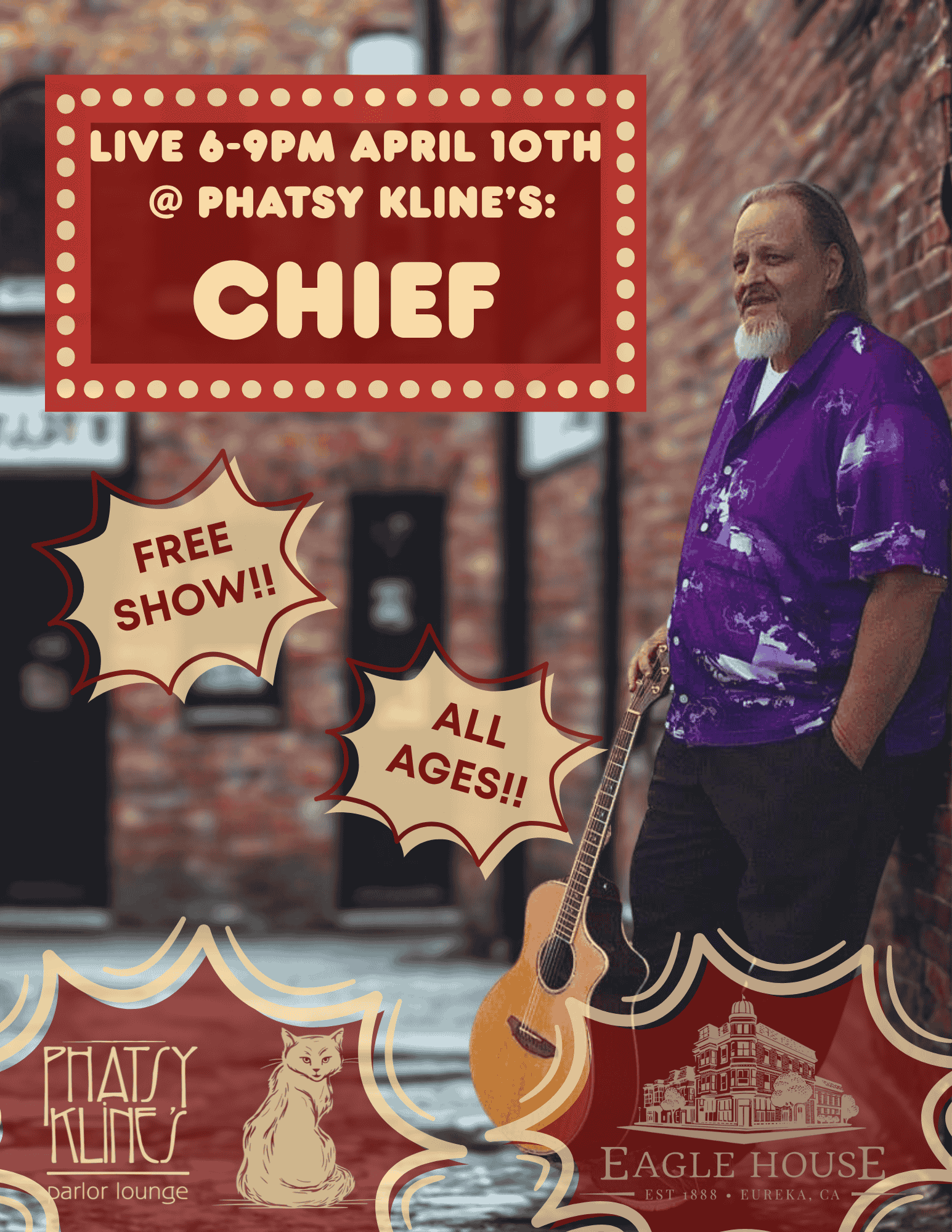 Chief plays acoustic guitar and sings. His music covers themes that are important to him such as: the environment, war, peace, love, kindness, addiction, homelessness, mental health , and yes, politics. He covers several different artists including Neil Young, Pink Floyd, George Jones, Paul Simon, The Grateful Dead, John Prine, Gordon Lightfoot and many more. What a perfect fit for The Phatsy Kline Parlor Lounge Stage. Free show for all ages!