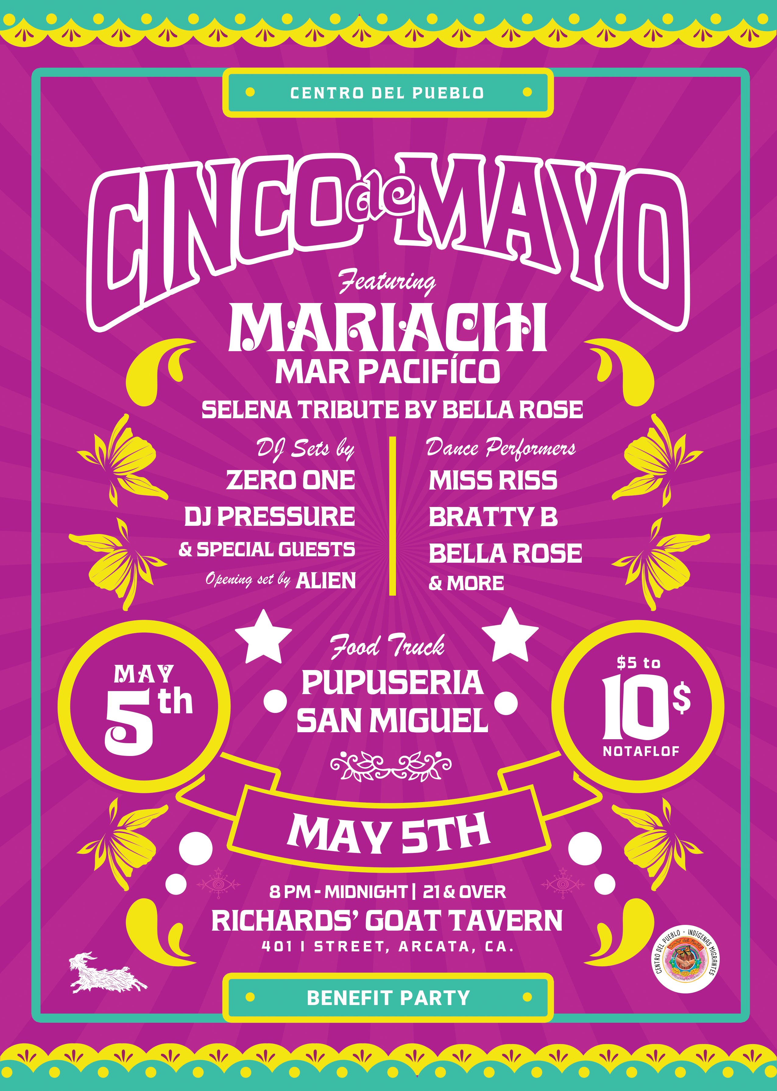 Join us for this amazing celebration and benefit for Centro Del Pueblo, brough to you by Fuego party starter DJ Pressure. Bar opens at 6pm for the Goat’s Taco Tuesday. Live music starts after 8pm inside the Miniplex with live music from Humboldt’s own Mariachi Mar Pacifico. The evening continues with DJ sets, Fuego Dancers, and late night eats by Pupuseria San Miguel. $10 suggested donation, notaflof. 21+