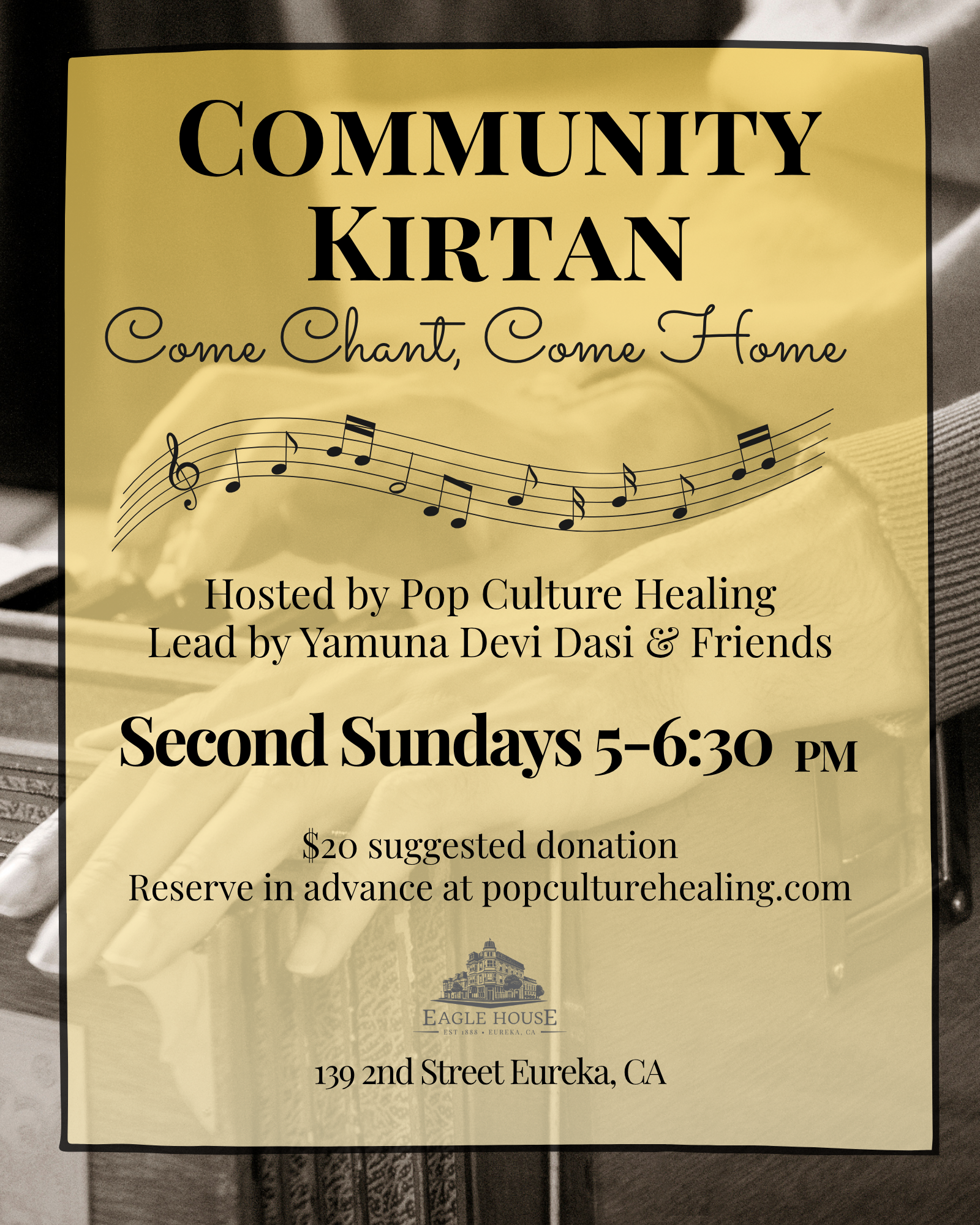 Come gather in community and devotion with us on the second Sunday of every month at 5 PM. Kirtan is the practice of chanting the divine names—a joyful expression of Bhakti yoga that opens the heart, quiets the mind, and connects us to each other. Whether you’re brand new to chanting or a longtime practitioner, your voice adds so much to the experience. Together we create a sacred space to lift our vibration and participate in this joyful spiritual practice.