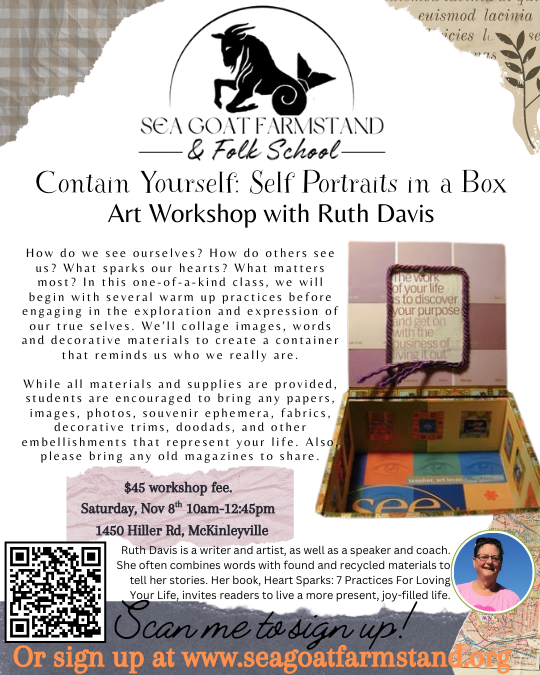 How do we see ourselves? How do others see us? What sparks our hearts? What matters most? In this one-of-a-kind class, we will begin with several warm up practices before engaging in the exploration and expression of our true selves. We’ll collage images, words and decorative materials to create a container that reminds us who we really are.