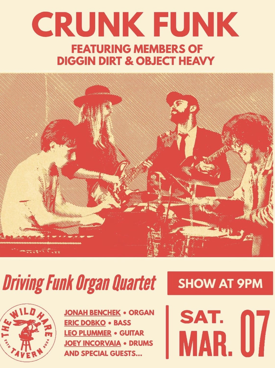 Come check out Crunk Funk ~ Driving Funk Organ Quartet! Featuring Members of Diggin Dirt & Object Heavy (just to name the one we can!)! Jonah Benchek on Organ, Eric Dobko on Bass, Leo Plummer on Guitar, Joey Incorvaia on Drums and special guests.