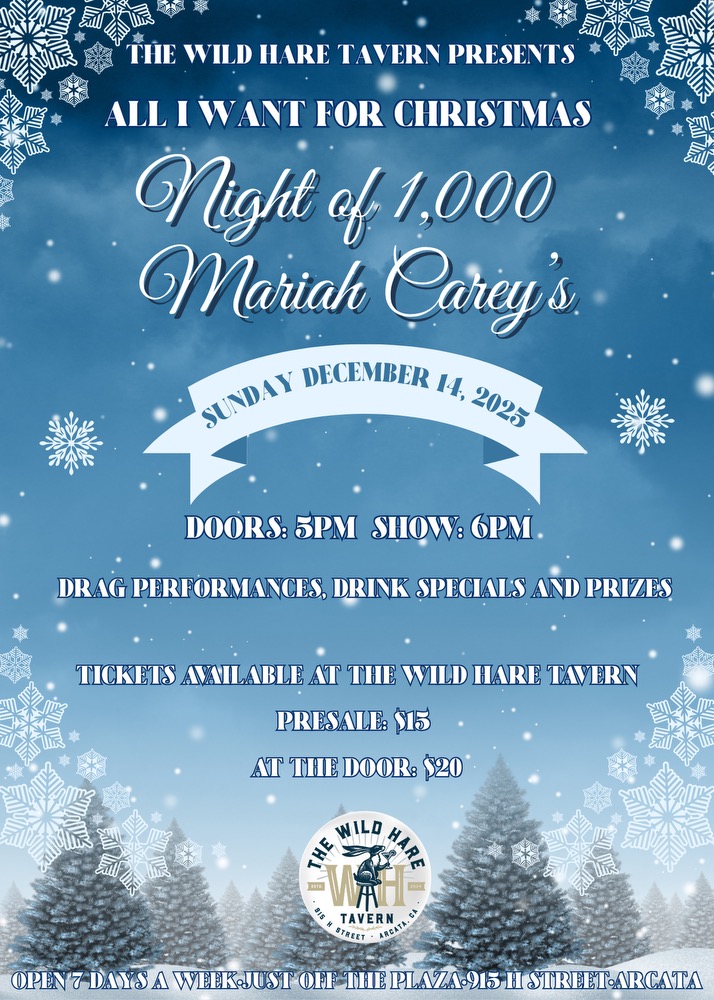 The Wild Hare Tavern Presents ALL I WANT FOR CHRISTMAS ~ NIGHT OF 1,000 Mariah Carey’s! Festive Drag performances, Drink Specials and Door Prizes! Wear your ugliest Christmas sweater to enter. $15 pre-sale, $20 Day of