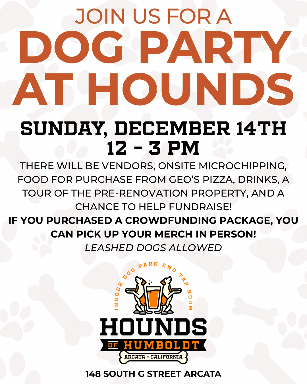 Join us for a Dog Party at Hounds of Humboldt! If you bought a crowdfunding package and live in town, you can pick it up at the event! (or another time/delivery of course) Geo’s Pizza will be posted up selling pizzas! We will also have Humboldt Spay, Two Rivers Pet and Wildlife Welfare Services, Pine Hill Pet Care, and Hucks Humboldt Hotties!