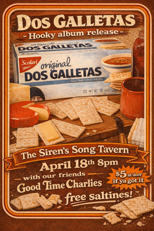 Come on out for a rocking good time in celebration of Dos Galletas first album! Garage rock, punk, folk.