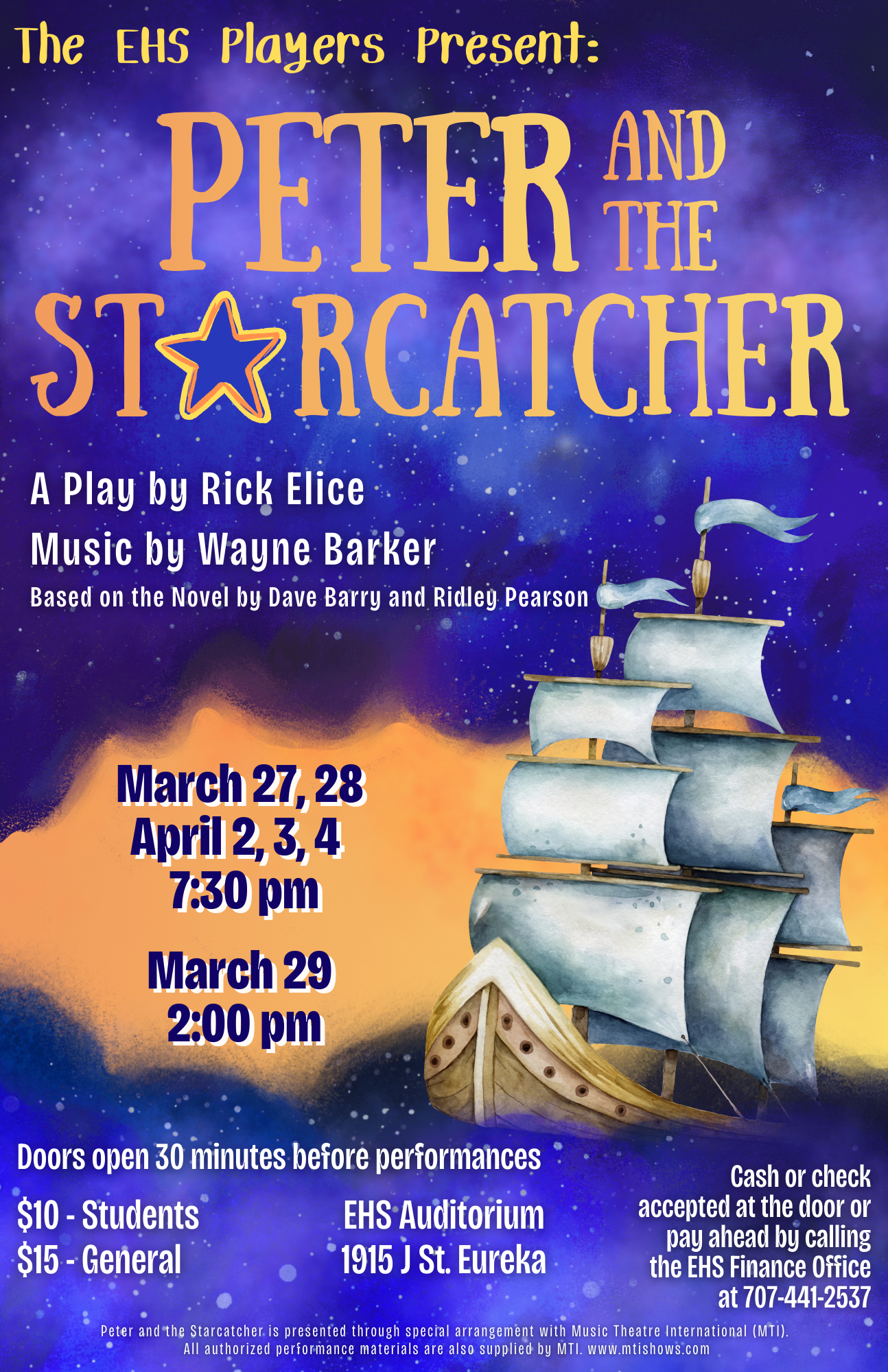 The EHS Players proudly present: Peter and the Starcatcher! This play is a fast-paced, wildly imaginative adventure that flips the Peter Pan legend on its head. When a nameless orphan boy crosses paths with a brave, brilliant young girl and a trunk full of mysterious starstuff, the journey to Neverland begins.