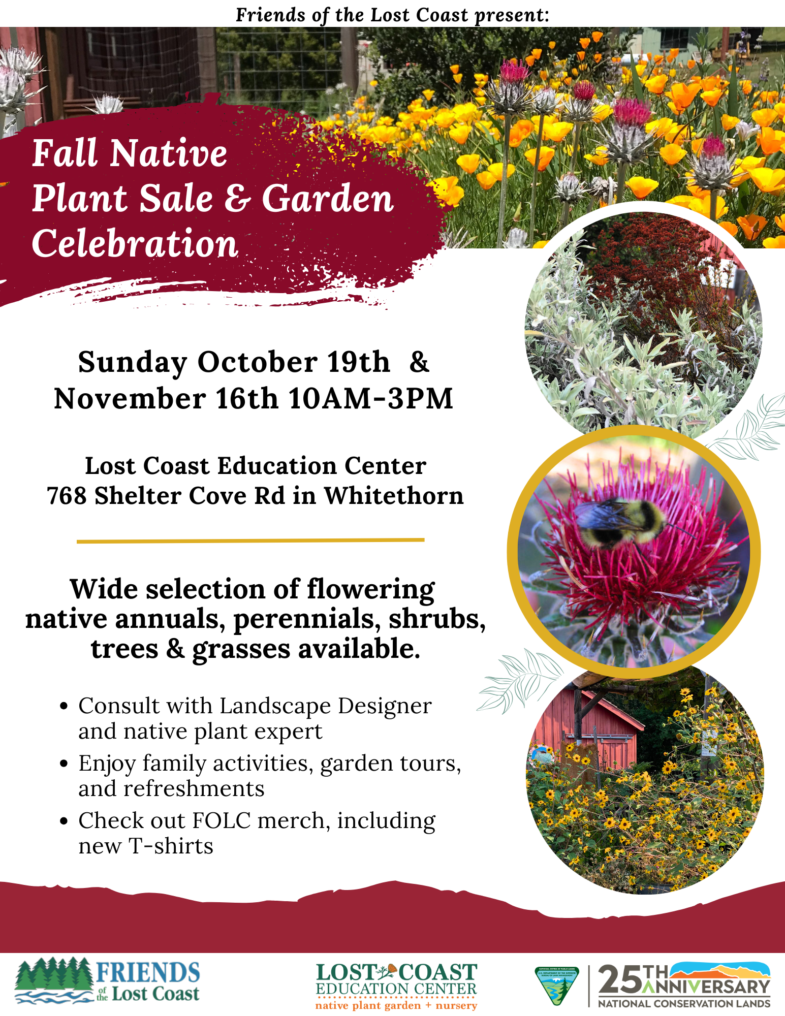 Autumn is a perfect time for planting β and on Sunday, October 19, Friends of the Lost Coast invite all to a Fall Native Plant Sale & Garden Celebration at the Lost Coast Education Center - 768 Shelter Cove Rd in Whitethorn. A wide selection of flowering native annuals, perennials, shrubs, trees and grasses is available β plus expert advice, garden tours, free coloring books, merchandise and more! Itβs happening on Sunday, October 19 from 10am to 3pm β and is the best opportunity in Southern Humboldt to stock up on native plants for your garden. For directions or available species, email info@lostcoast.org.