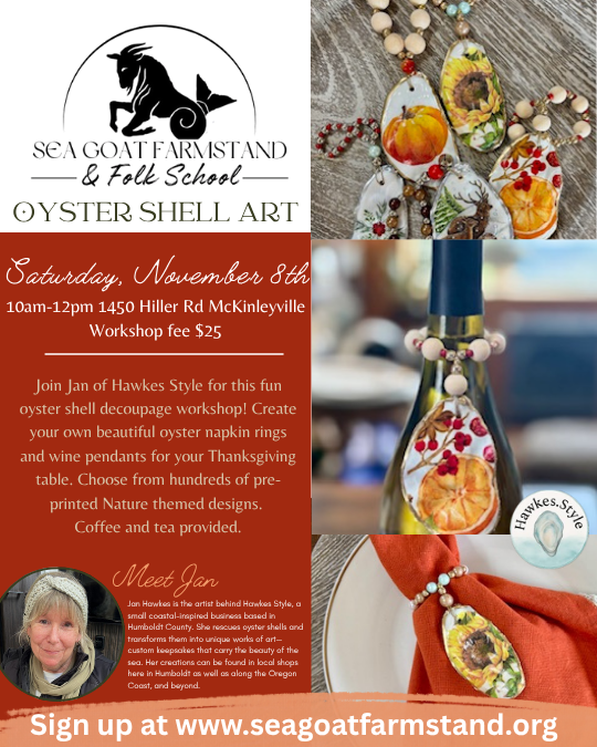 Join Jan of Hawkes Style for this fun oyster shell decoupage workshop! Create your own beautiful oyster napkin rings and wine pendants for your Thanksgiving table. Choose from hundreds of pre-printed Nature themed designs.
