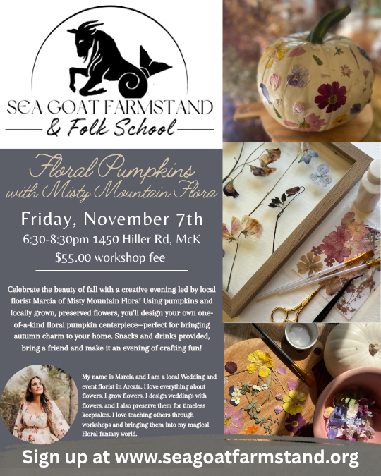 Celebrate the beauty of fall with a creative evening led by local florist Marcia of Misty Mountain Flora! Using pumpkins and locally grown, preserved flowers, you’ll design your own one-of-a-kind floral pumpkin centerpiece—perfect for bringing autumn charm to your home. Snacks and drinks provided, bring a friend and make it an evening of crafting fun!