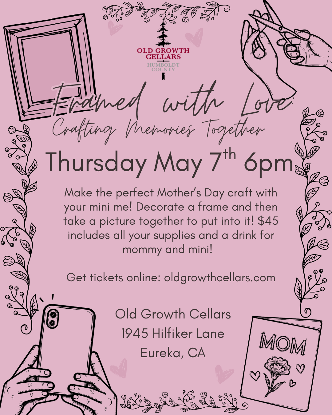 The perfect Mother’s Day Craft! Join us for Framed with Love: Crafting Memories with Love. Decorate a frame with your mini and then take a picture together at the end of the night! $45 gets you all your supplies plus a drink for mommy & mini. Get your tickets online at oldgrowthcellars.com