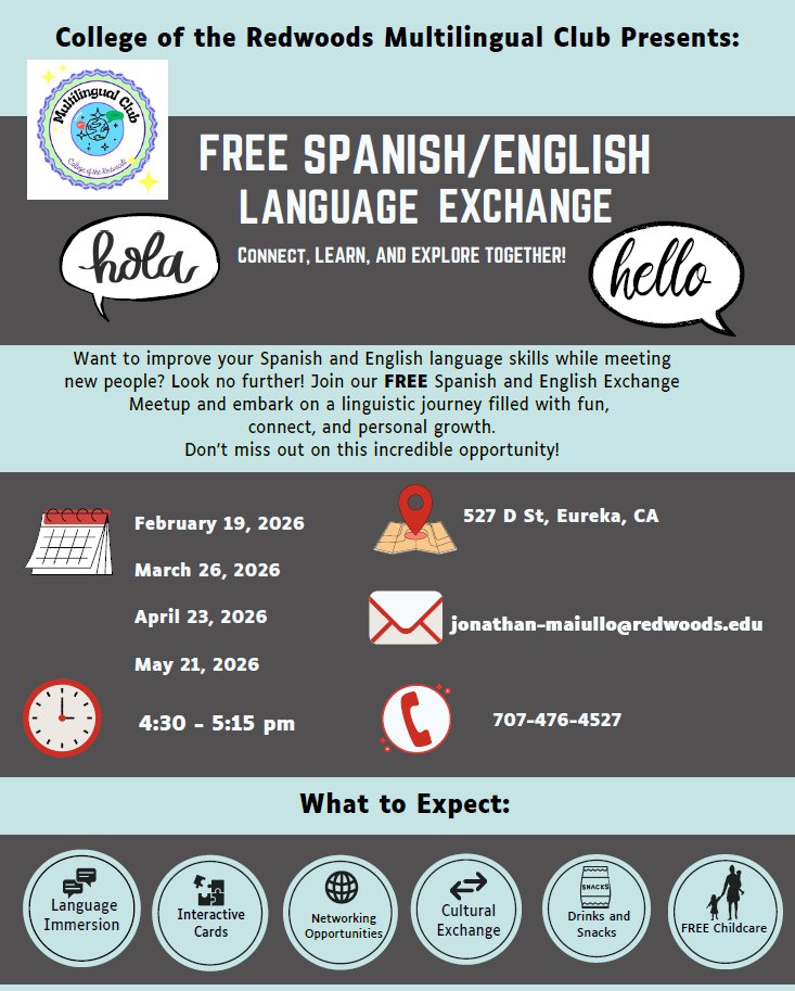 Free opportunity to practice Spanish with first-language speakers through College of the Redwoods’ Multilingual Club. Oportunidad gratuita para practicar inglés con el Club Multilingüe de College of the Redwoods. Merienda incluida. Nos vemos allí 527 D St. en Eureka