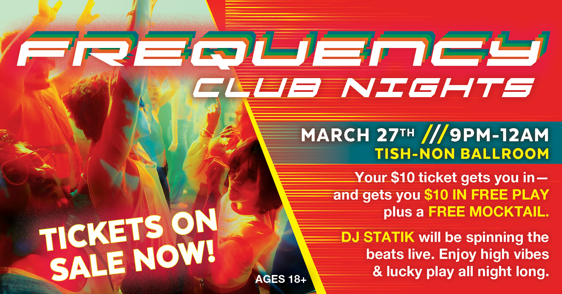 Frequency Club Nights takes over the Tish-Non Ballroom for an evening of music, movement, and casino perks. DJ Statik will be spinning live throughout the night, keeping the dance floor going from start to finish.