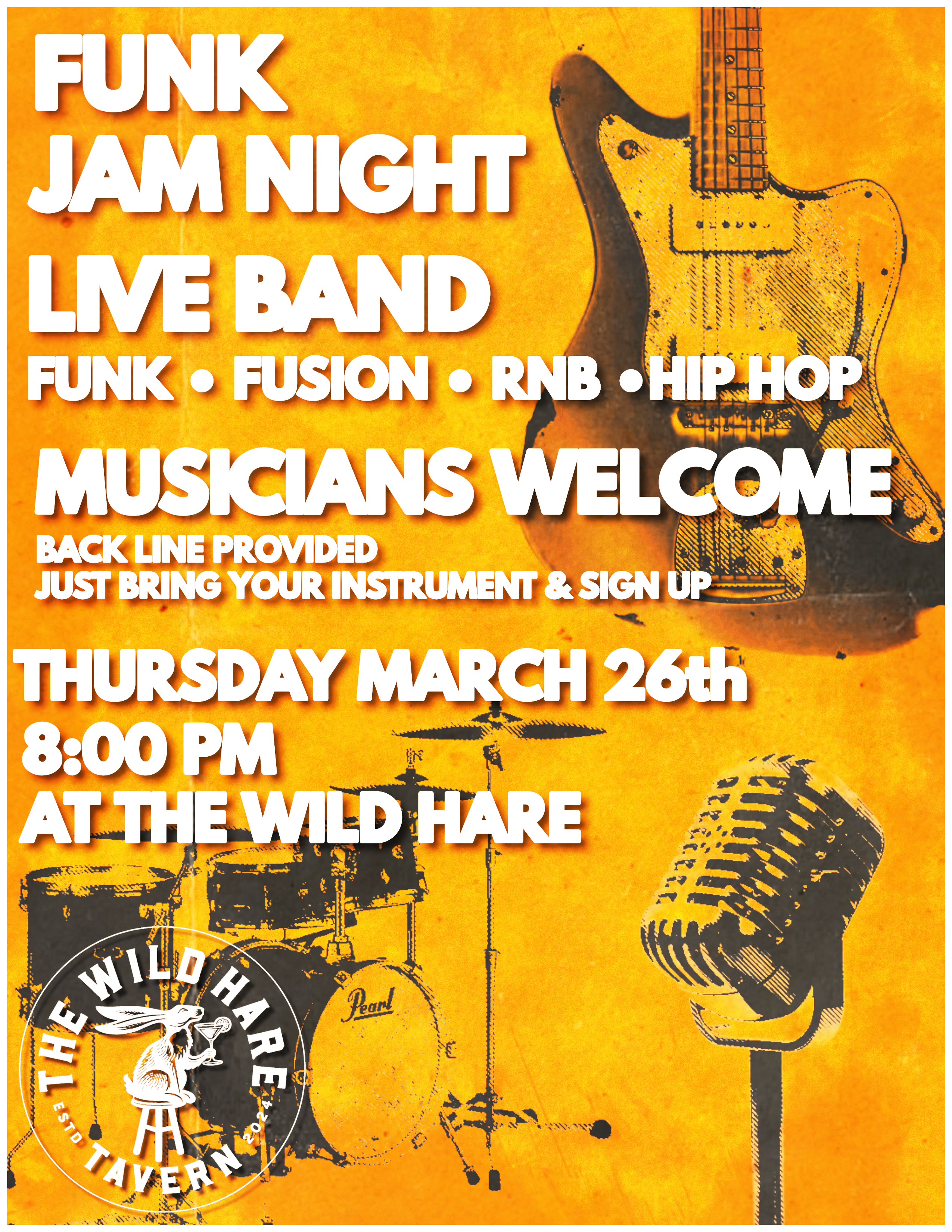 Funk ~ Fusion ~ RNB ~ Hip Hop ~ Musicians Welcome! Back line provided, Just bring your instruments & Sign Up!