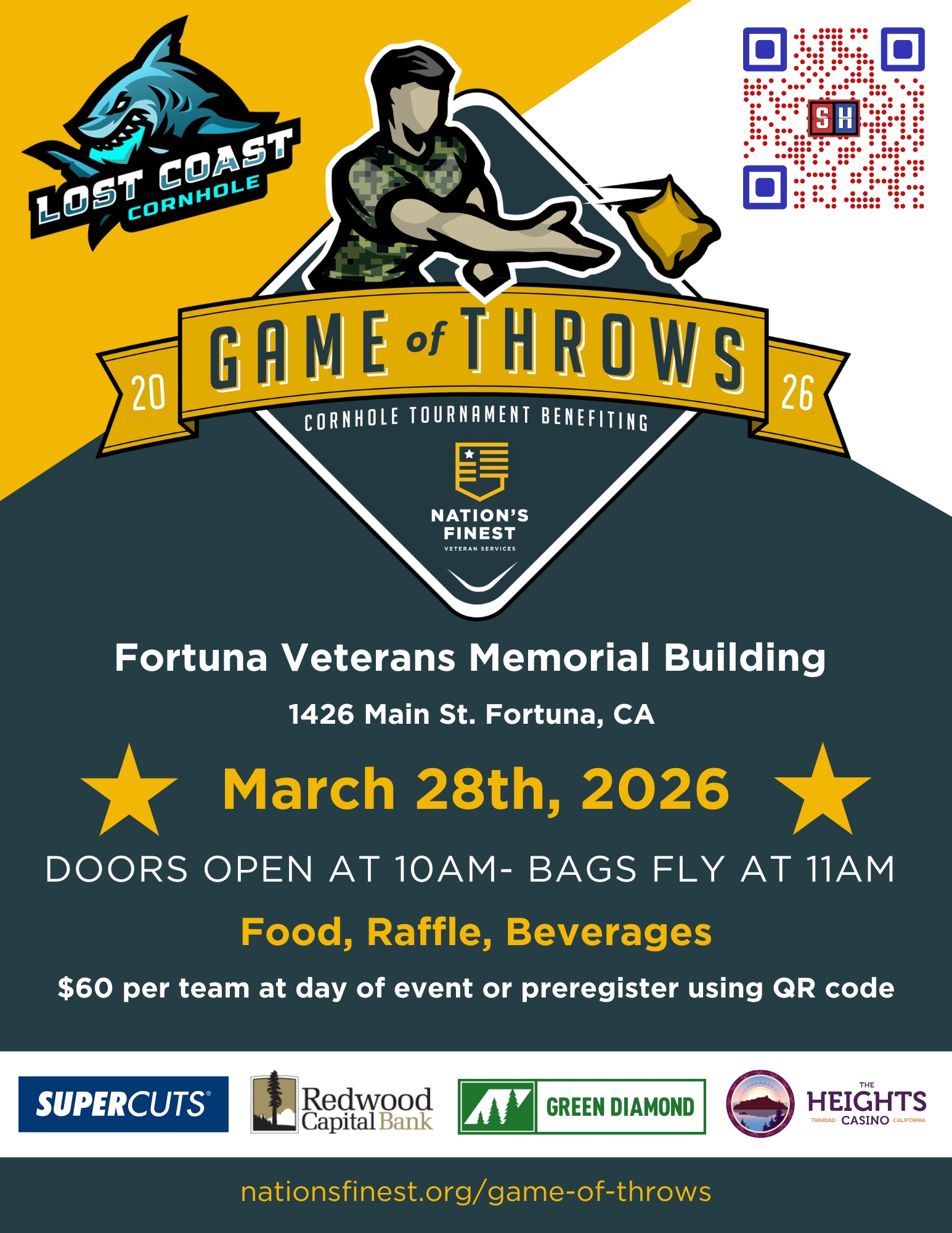 5th Annual Game of Throws Cornhole Tournament by Nations Finest. Come play cornhole win trophies get some nachos made and buy tickets for a raffle to win prizes like a Blackstone griddle, rounds of golf, Hammock, Furniture store gift cards, car shop gift cards, stays at hotels, a 10 person tent with screen room and more. All in a effort to raise money for homeless veterans and the services they need