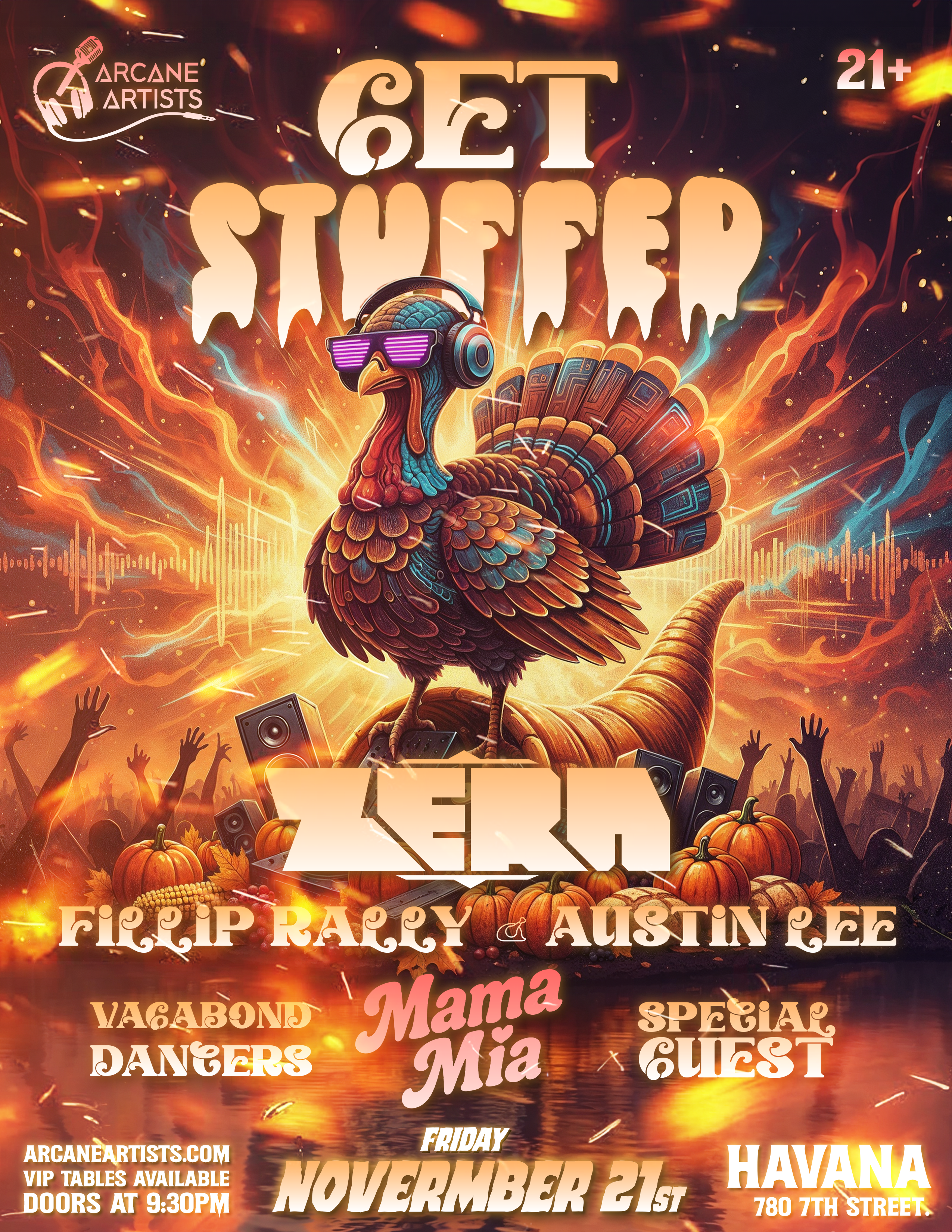 It’s time to get stuffed… with the spirit of dancing and good times. Head down to Havana this Friday to kick off the weekend to the beats of a Humboldt favorite and great bass house heavy hitter, ZERA. Catch him throwing down some thick beats as we dance the night away. He will be joined by club house and tech house artist, AUSTIN LEE and disco house artist FILLIP RALLY who will be throwing in a few other surprises to his set. We also have amazing pop vocalist, MAMA MIA coming back to Kay down some tracks for you as well as the amazing Vagabond Dancers! Grab a deal with your friends and snag a VIP booth where you can have all your needs met and avoid any bar lines.