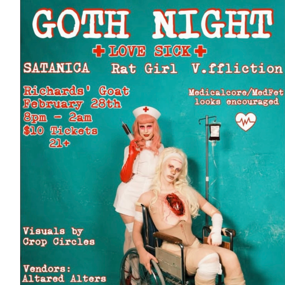 It’s the first Goth Night of 2026, and this February’s hearts will be the anatomical variety. Love sick? A lot of emotion stored up? Goth Night has just the cure! One prescribed night of dancing, or convulsing, whichever you so choose, surrounded by your dark hearted community ~ let the music kiss it and make it better. This month’s theme is “Love Sick,” and DJs Satanica, Rat Girl, and Vffliction will be spinning the music to heal/steal your soul through dance. Visuals by Crop Circles, food by Los Giles, and featured vendor Altared Alters will be on-site for your goth jewelry needs. Medicalcore/fetish looks are encouraged. $10 cover, 21 and up only.