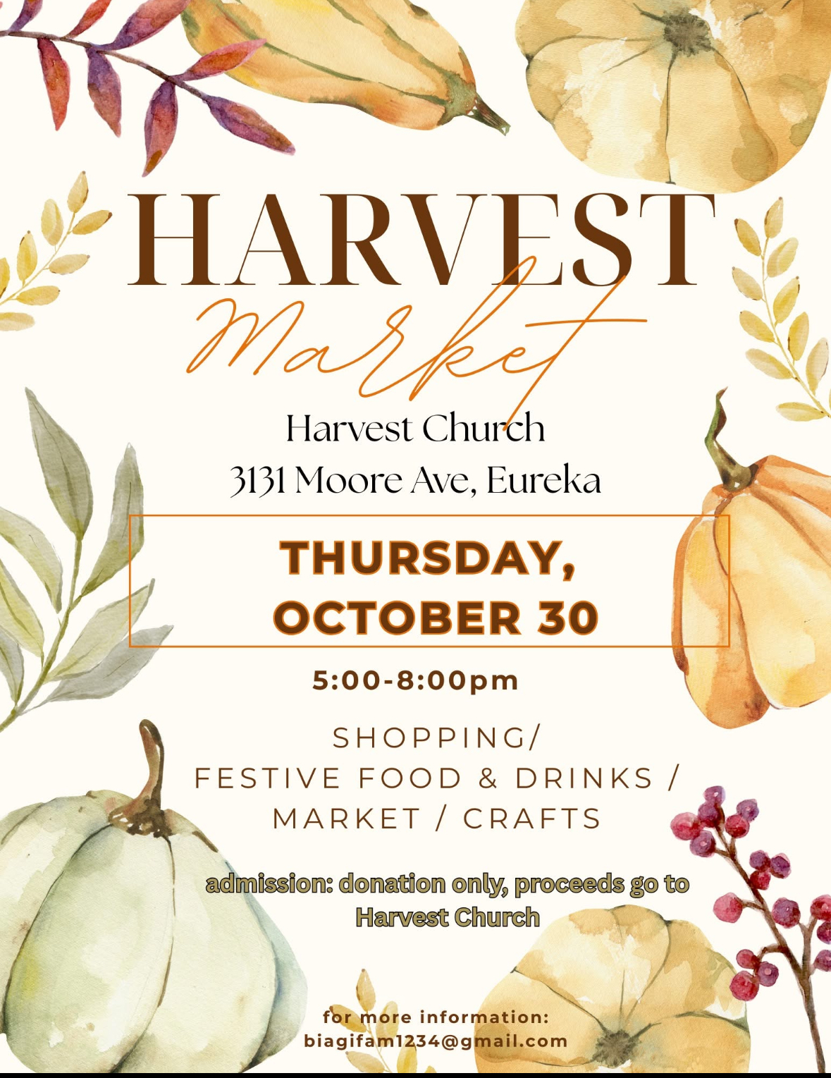 Join us for a night of shopping, food, treats and supporting your local community. This first annual Harvest Market will be a kick off to your holiday shopping. Admission is “donation only” with proceeds benefiting Harvest Church. We hope to see you there.