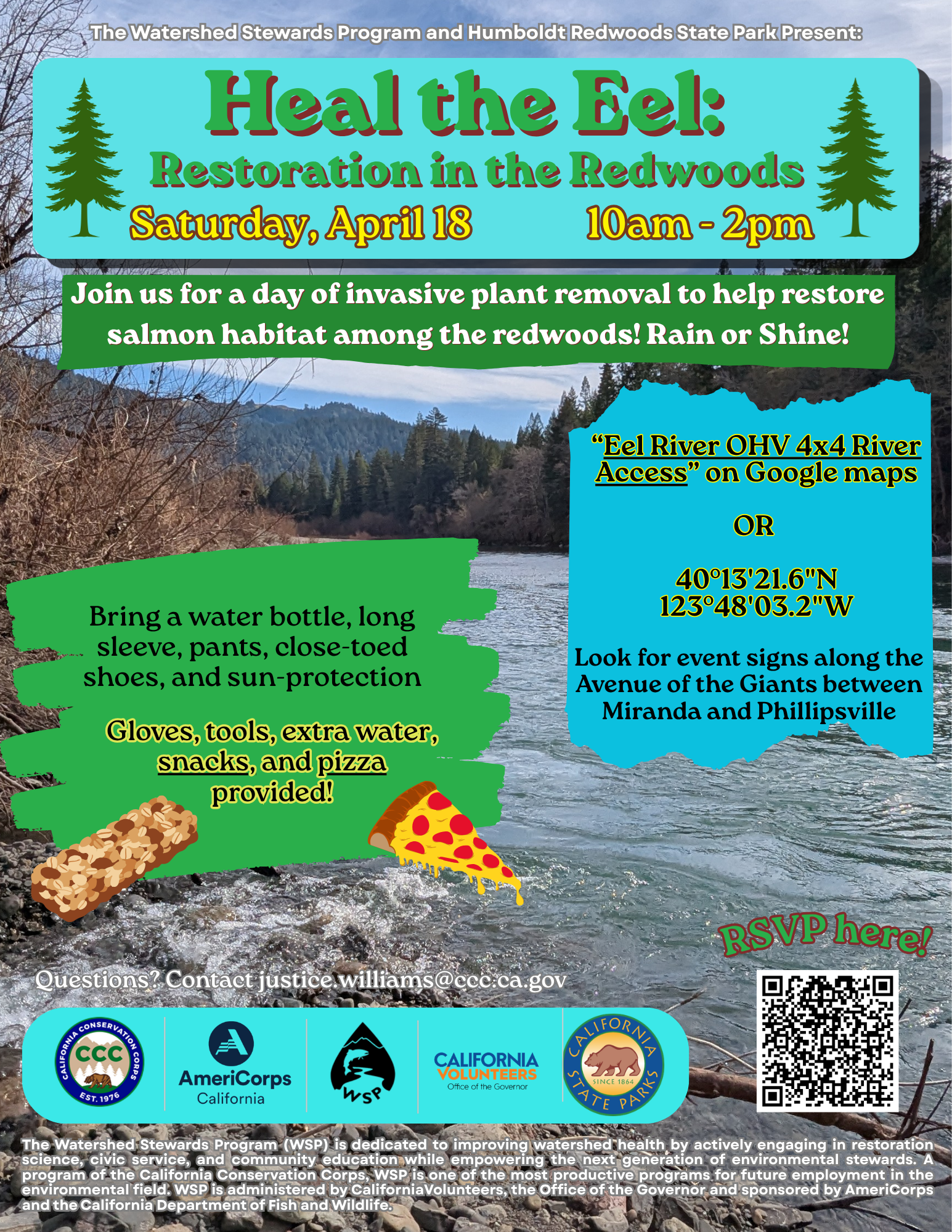 Join the Watershed Stewards Program for Heal the Eel: Restoration in the Redwoods on Saturday, April 18th from 10am – 2pm at the “Eel River OHV 4x4 River Access” area, a few minutes north of Phillipsville, along the Avenue of the Giants. Help restore salmonid habitat and our native redwood forest ecosystem by pulling invasive ivy near the beautiful South Fork Eel River! Come participate in meaningful community stewardship! Gloves, tools, water, snacks, beverages, and pizza will be provided. The event will happen rain or shine and all are welcome. Hope to see you there!