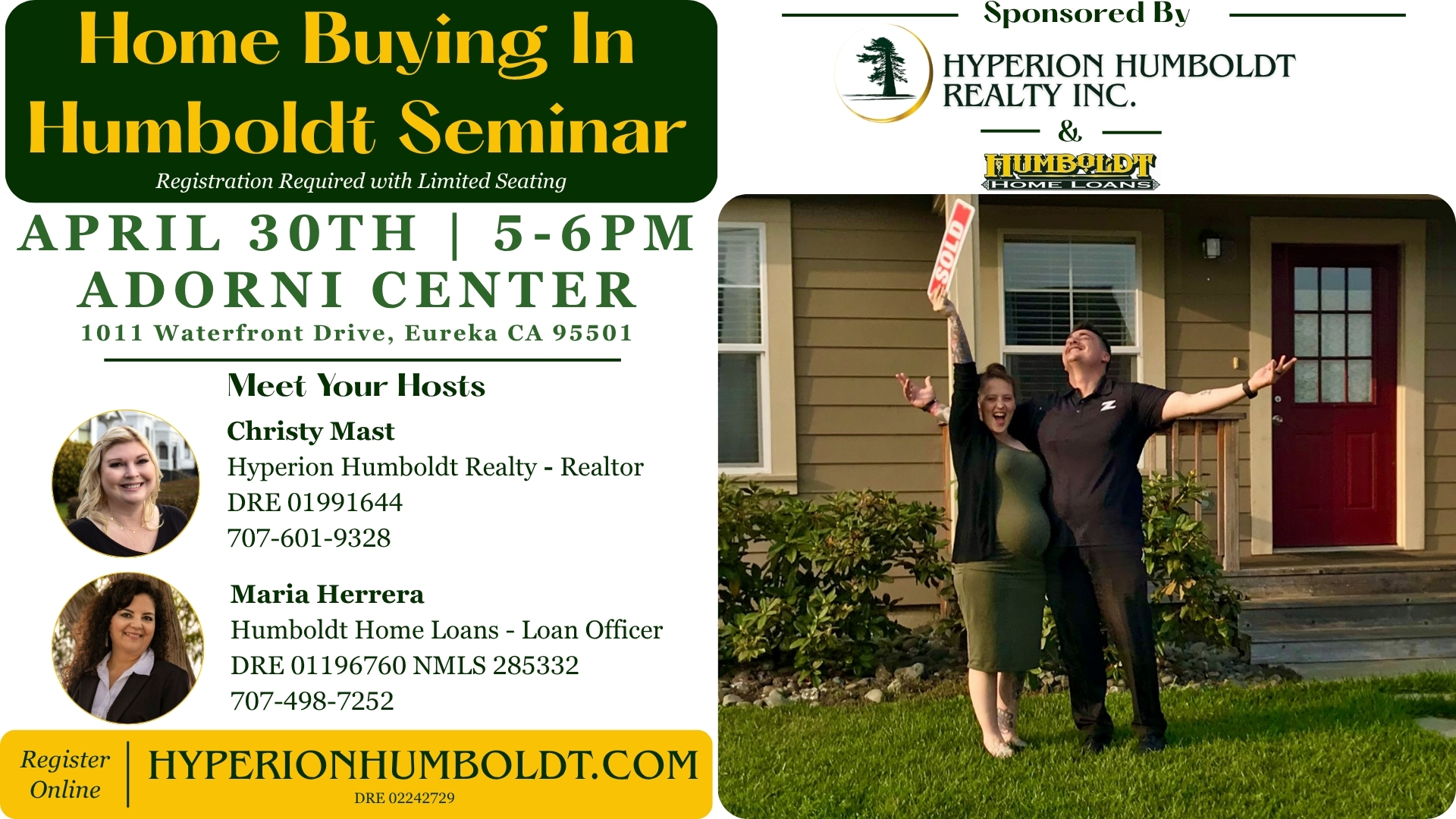 Sponsored by Hyperion Humboldt Realty and Humboldt Home Loans, this free home buying seminar features experienced local experts ready to guide you through the unique dynamics of Humboldt County’s real estate market. Join Christy Mast, Realtor and Maria Herrera, loan officer as they share valuable insights on financing, navigating the buying process, and making confident decisions in today’s market.