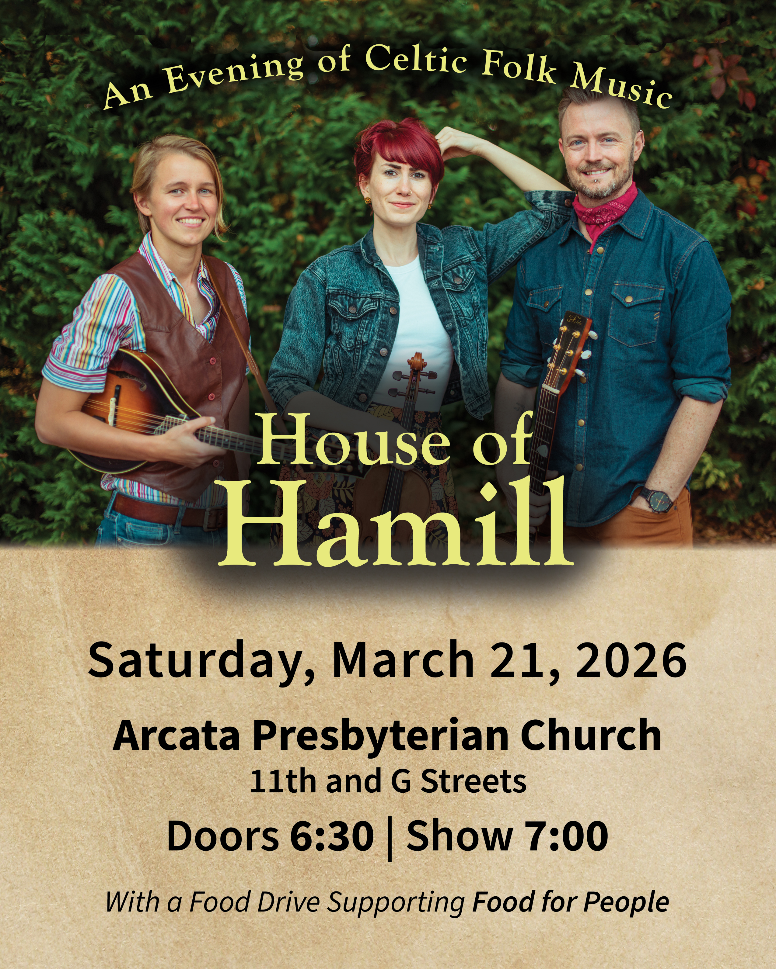 Celtic folk trio House of Hamill is coming to Arcata for an intimate, seated concert at Arcata Presbyterian Church! Join us for a night of high-energy fiddle tunes, rich three-part harmonies, and plenty of onstage storytelling.
