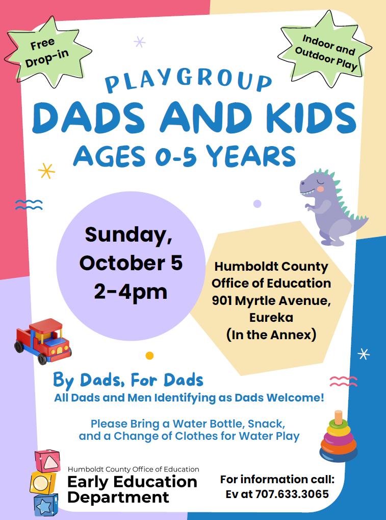 Come join the Humboldt Dads Group for a playdate on 10/5 from 2-4 pm! We’ll be in the annex of the HCOE offices (same as last month). Make new dad friends and reconnect with others!