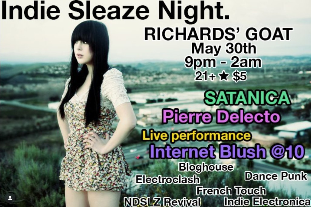 The late-00s - mid-10s are back.. join DJs SATANICA and Pierre Delecto for a night of indie electronica, bloghouse, dance punk, & electroclash featuring a LIVE performance by Internet Blush!