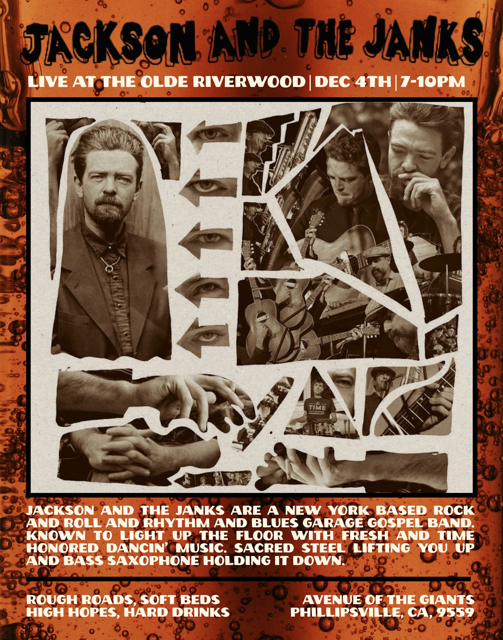 This Thursday, 12/4 from 7-10 PM, we’re bringing Jackson and the Janks to the stage at The Olde Riverwood. Jackson and the Janks are a New York-based rock-and-roll, rhythm-and-blues, garage gospel band. Known to light up the floor with fresh and time-honored dancin’ music. Sacred steel lifting you up and bass saxophone holding it down.