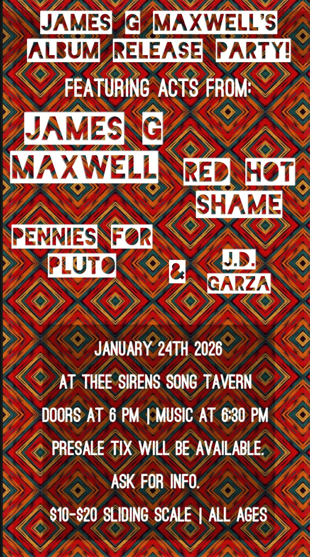 James G. Maxwell’s Album Release Party @ The Siren’s Song Tavern - 1/24/26 - Red Hot Shame, Pennies For Pluto, & J.D. Garza-Valencia