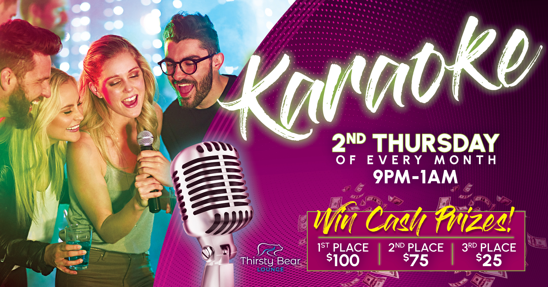 Thursday, November 13th – Join us for an exciting karaoke night at The Thirsty Bear Lounge! Sing your favorite tunes and compete for cash prizes in a lively atmosphere. 21+.