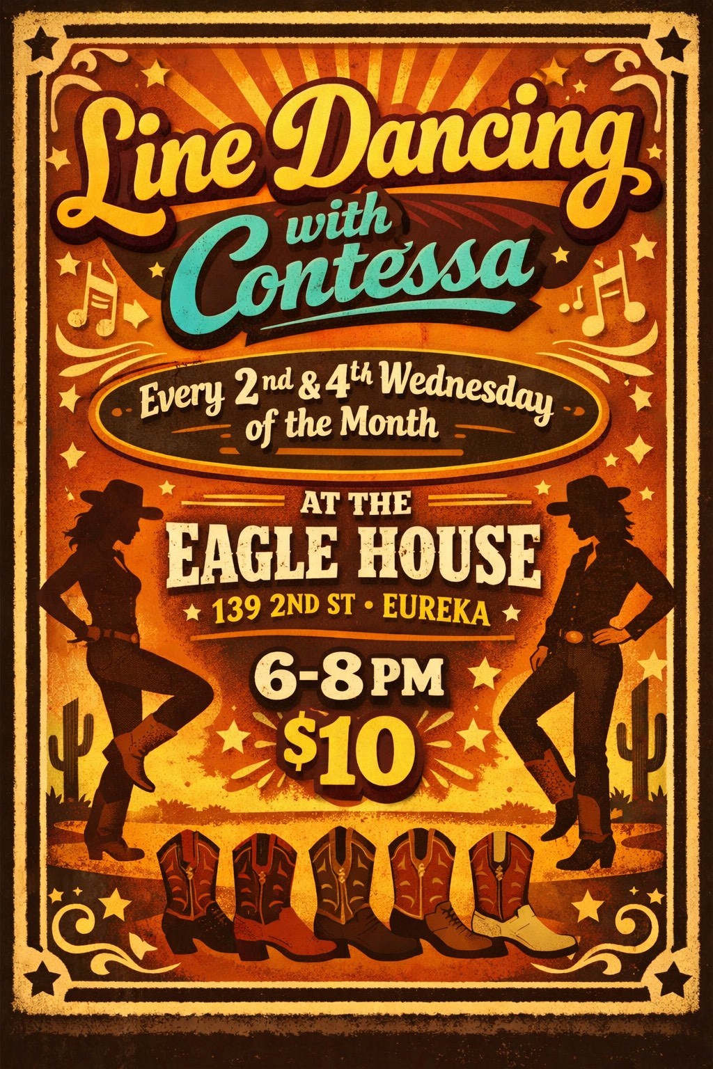 Line dance lessons with Contessa every 2nd & 4th Wednesday at the Eagle House! All levels and ages welcome!