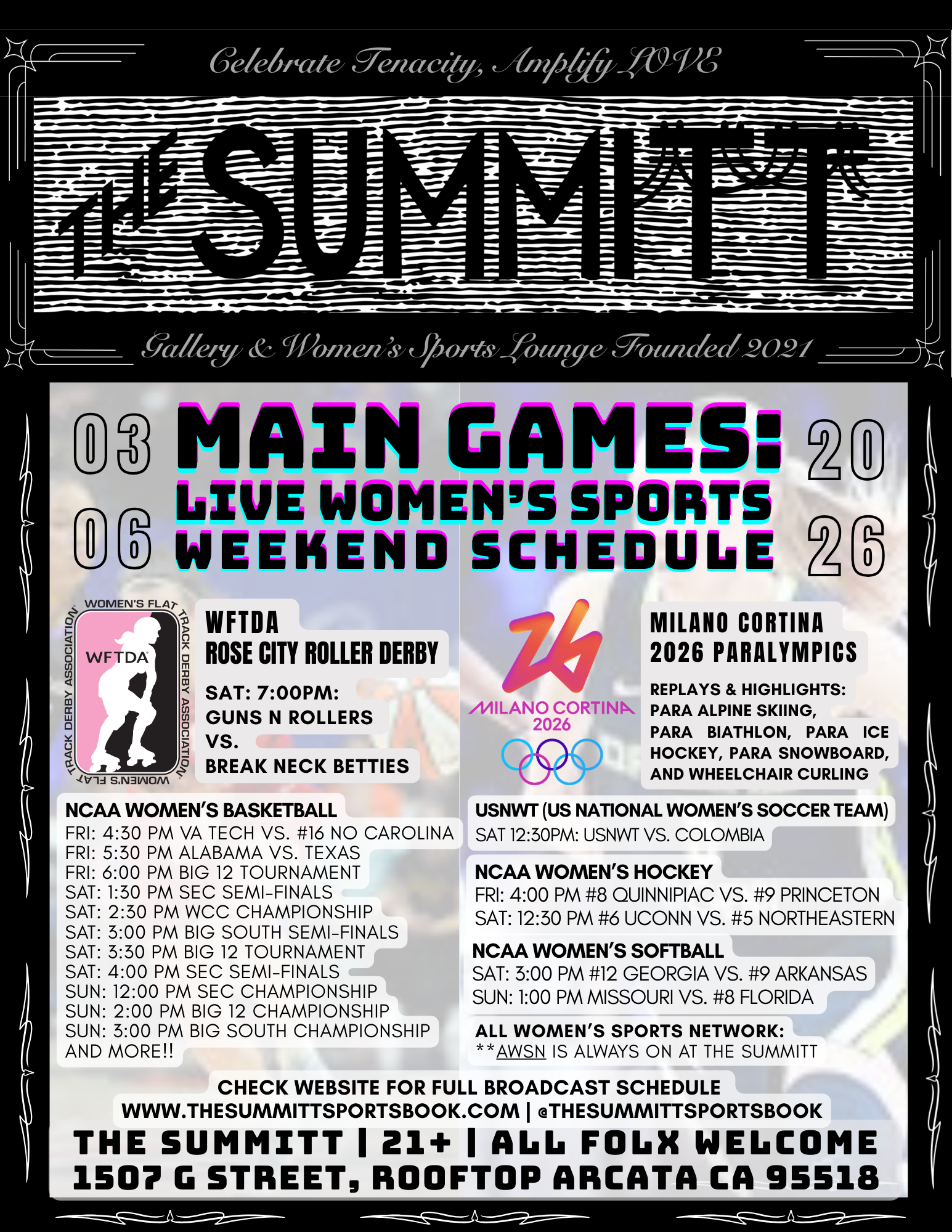 US Women’s Soccer, NCAAW Basketball Conference Tournaments, Roller Derby, Paralympics, PWHL, LOVB, NCAA Softball and MORE!!
