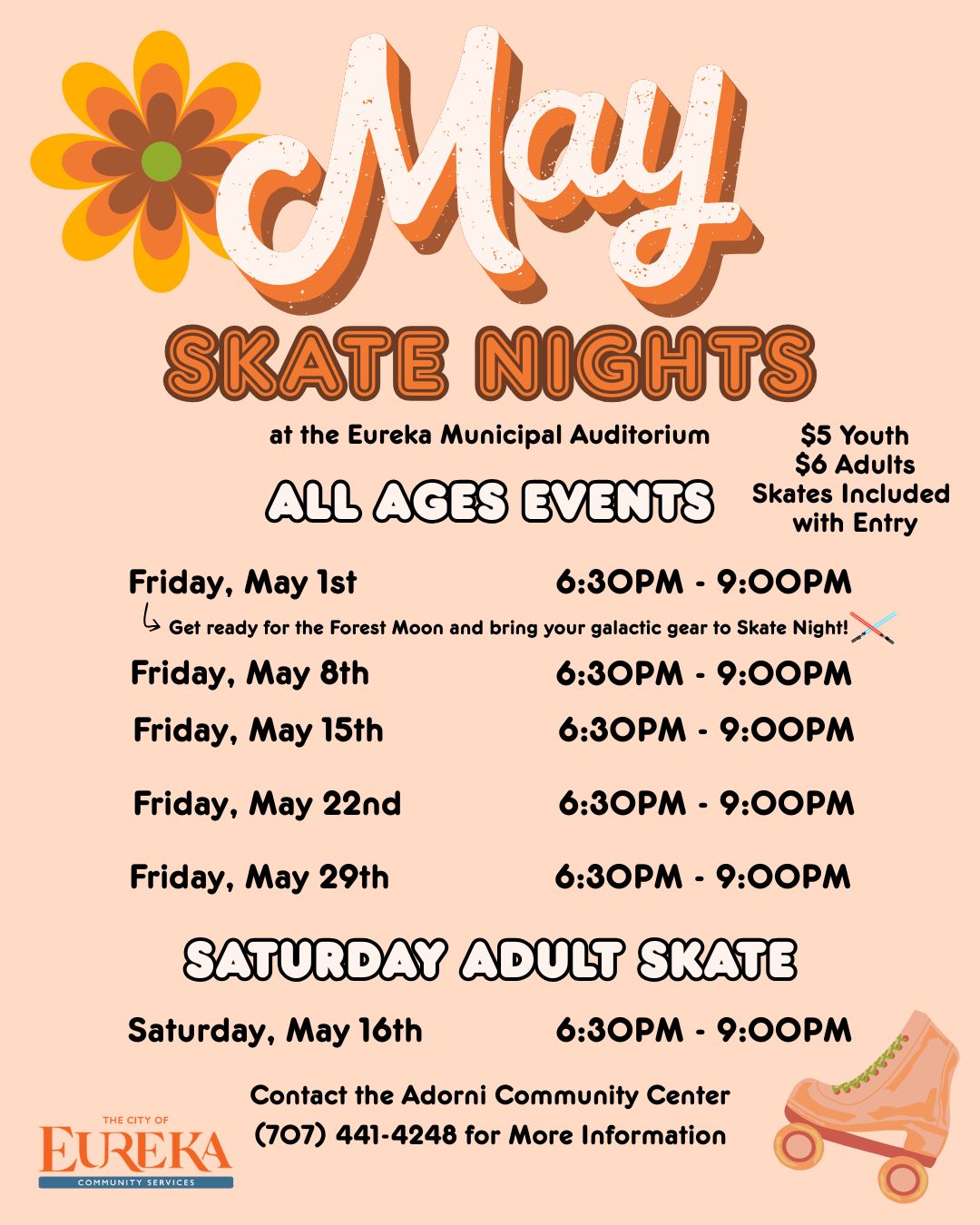 - Friday, May 1st 6:30PM-9PM ALL AGES (Get ready for the Forest Moon and bring your galactic gear to Skate Night!)