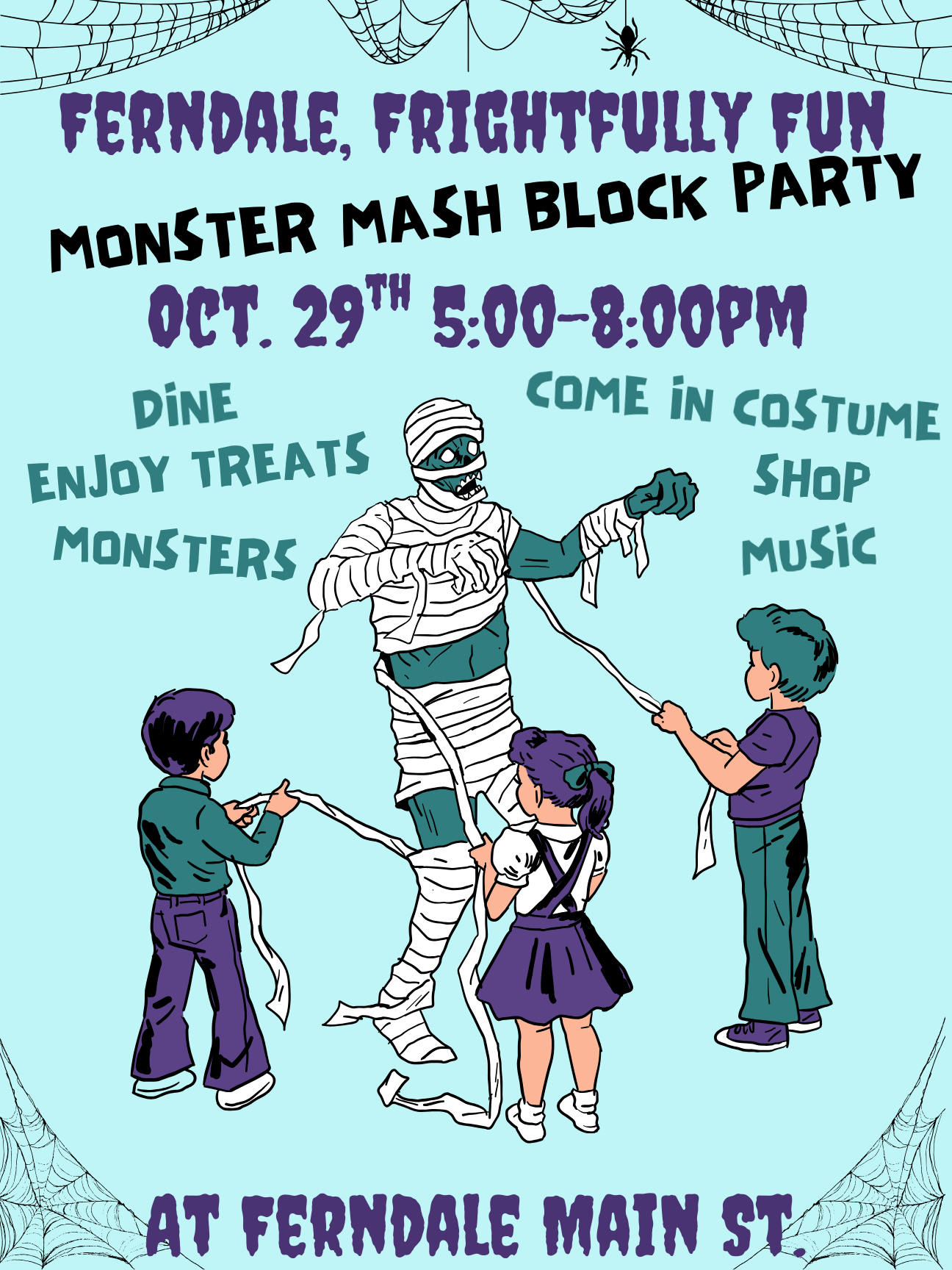 Get ready to dance the night away at Ferndale Frightfully Fun’s Monster Mash Block Party—a Halloween celebration that turns Main Street into one big, spirited bash! Shops will stay open late, inviting you to browse, shop, and snack while enjoying festive music and dazzling party lights that set the whole street aglow. Kids can collect treats from local stores while the grown-ups join the fun, shopping and dancing in costume under the lights. Please wear a costume and meet our roaming monsters for pictures—they can’t wait to haunt your memories with a frightfully fun photo op. Whether you come for the candy, the music, or the magic of Ferndale after dark, the Monster Mash Block Party is the place to be for a night of Halloween cheer the whole family will love.