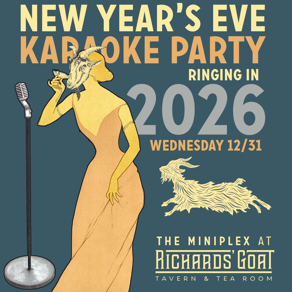Get dressed up in your best sparkles and suits, because it’s The Goat’s semi-annual New Year’s Eve karaoke party! Come have affordable champagne cocktails and ring in THE FINALLLL COUNTDOWNNNN with us! Bar opens at 8 pm, song signups start at 8:30 pm, 21 & up only.