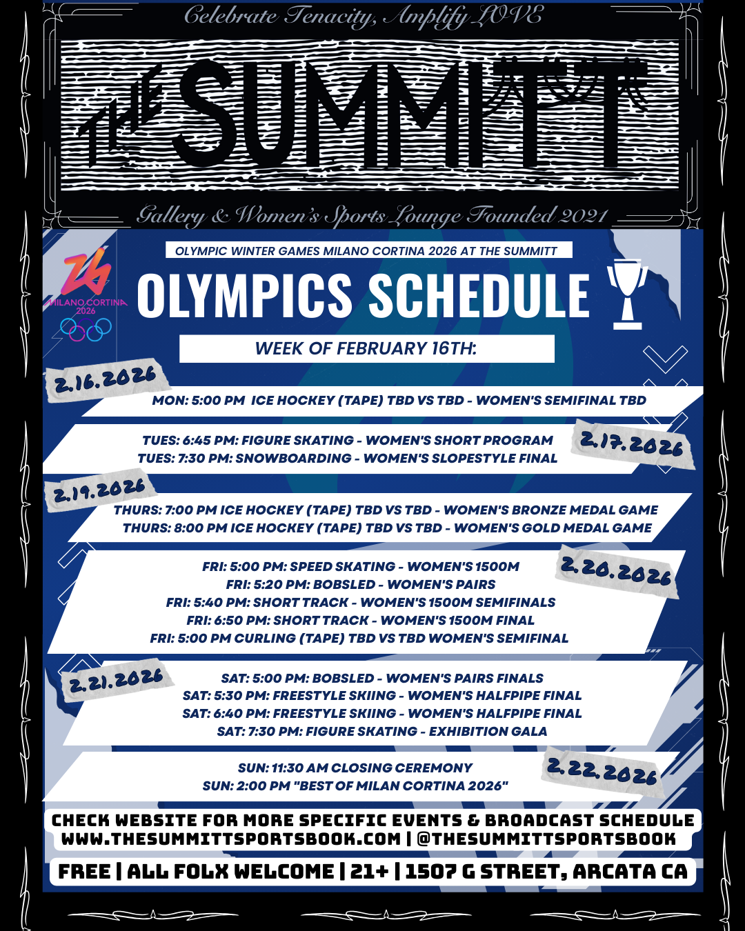 Due to the games being in Milano, Italy (9 hours in the future)… most of the games that we have scheduled are ‘replays’ or ‘TAPE’ from an earlier broadcast… but it’s funner with a group, so we hope to catch some games and events with you!! We have noted the broadcasts that will be streaming LIVE in our schedule. If you don’t see an event that you’re hoping to catch, let us know! And, we’ll try to open up the space and make it happen!