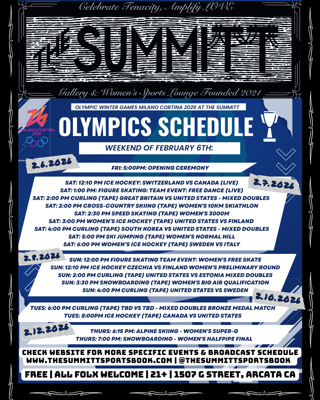 SAT: 6:00 pm Ice Hockey (TAPE) Sweden vs Italy - Women’s Preliminary Round