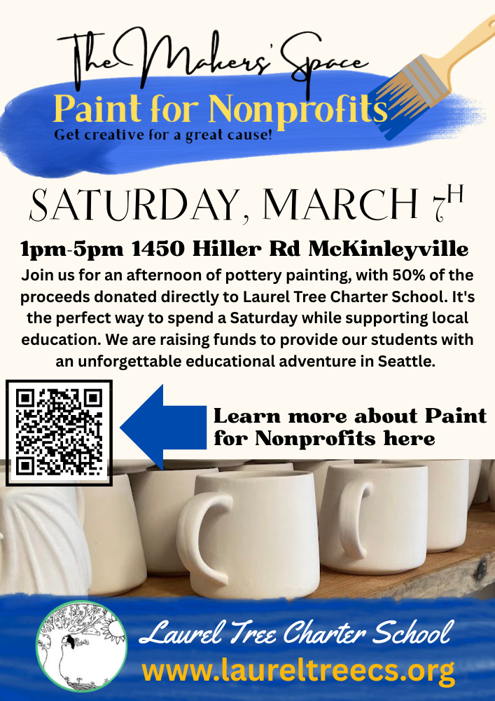 Join us for a creative afternoon of pottery painting at The Makers’ Space—where art meets impact. We’re donating 50% of all proceeds to Laurel Tree Charter School, helping fund an unforgettable educational adventure to Seattle for local students.