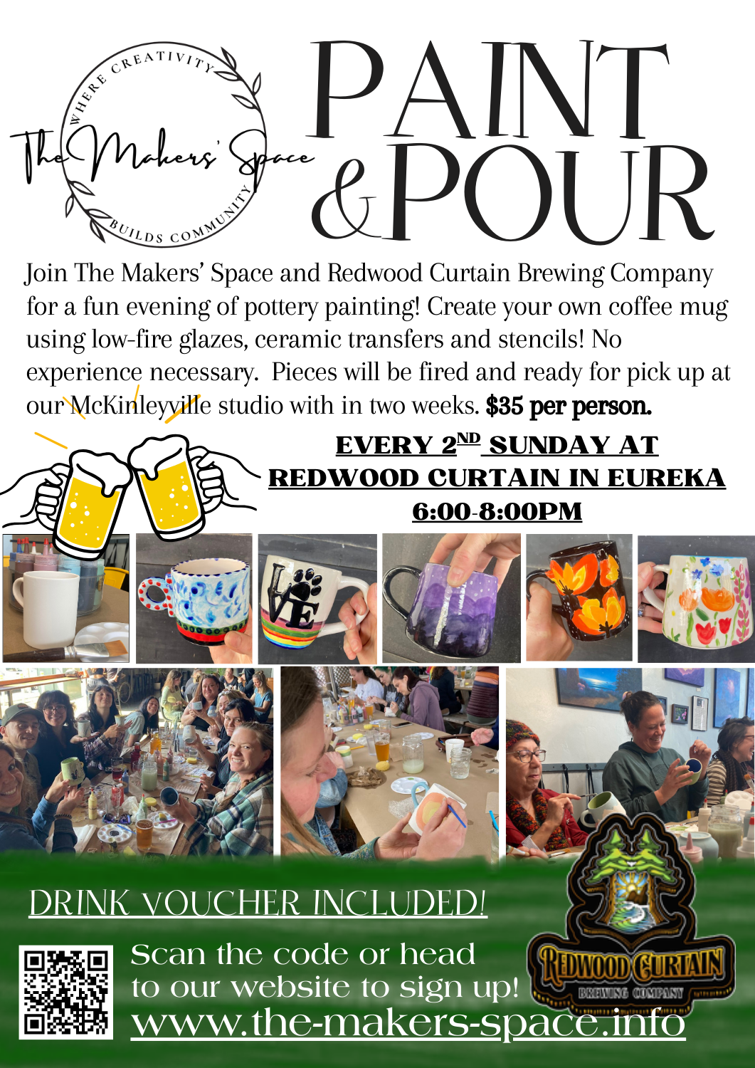 Join The Makers’ Space and Redwood Curtain Brewing Company for a fun evening of pottery painting! Create your own coffee mug using low-fire glazes, ceramic transfers and stencils! No experience necessary. Pieces will be fired and ready for pick up at our McKinleyville studio with in two weeks. $35 per person.