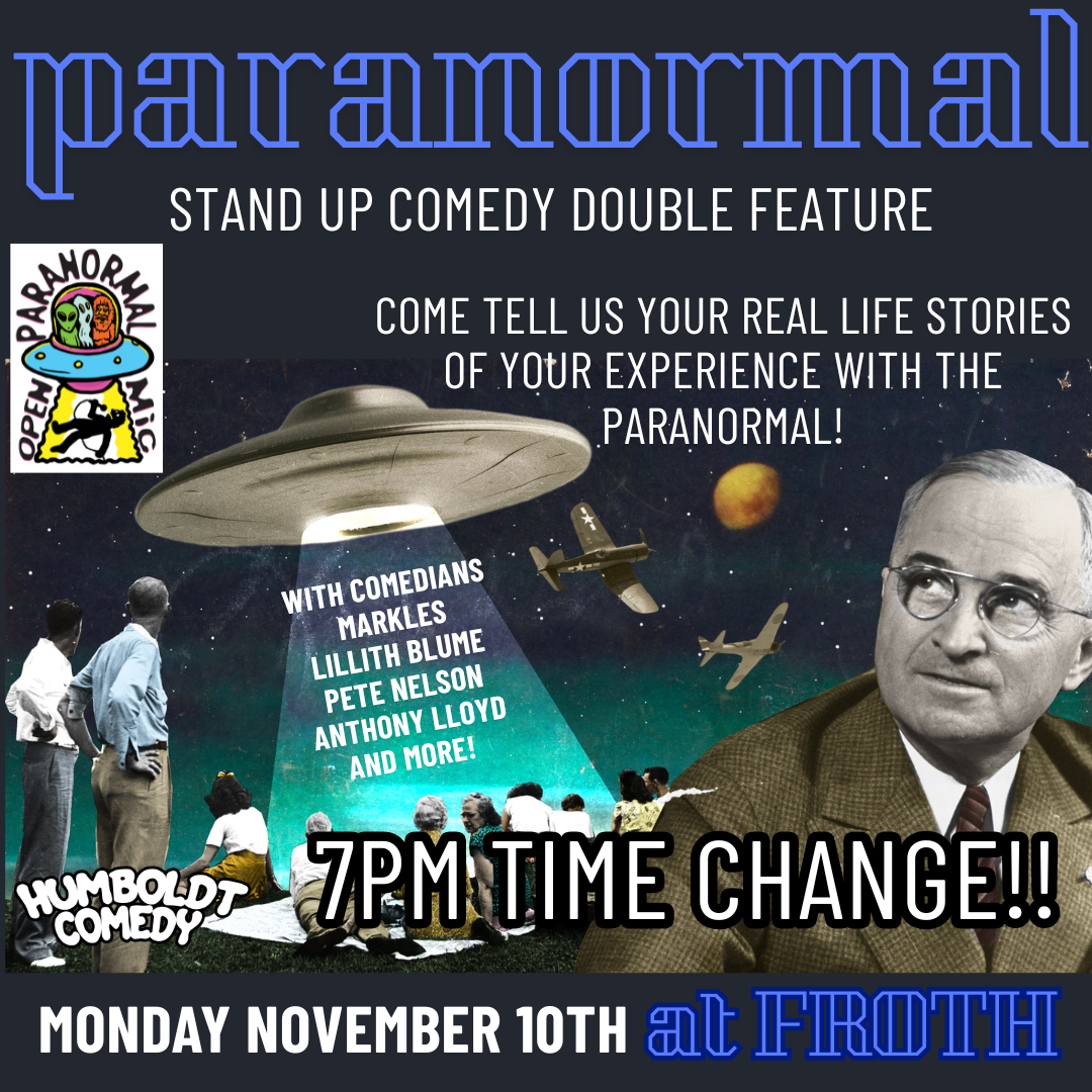 Paranormal Open Mic (@paranormalopenmic) is a weekly storytelling event at Froth in Arcata where community members are invited to tell their real life stories of the unexplained. Stories must be from your own true experiences, not under the influence of substances! We have a panel of comedians, ghost hunters, and other enthusiasts then interview you, and engage in your experience. These panelists are instructed to treat all storytellers with respect and acknowledgement that these stories are real. Various slide presentations are also made on the projector about different paranormal or unexplained themes and subjects that are also discussed. Stories are expected to be kept relatively brief, under 7 minutes… Come watch the event and support these unique individuals, this could happen to you! Created by Comedian Pete Nelson.
