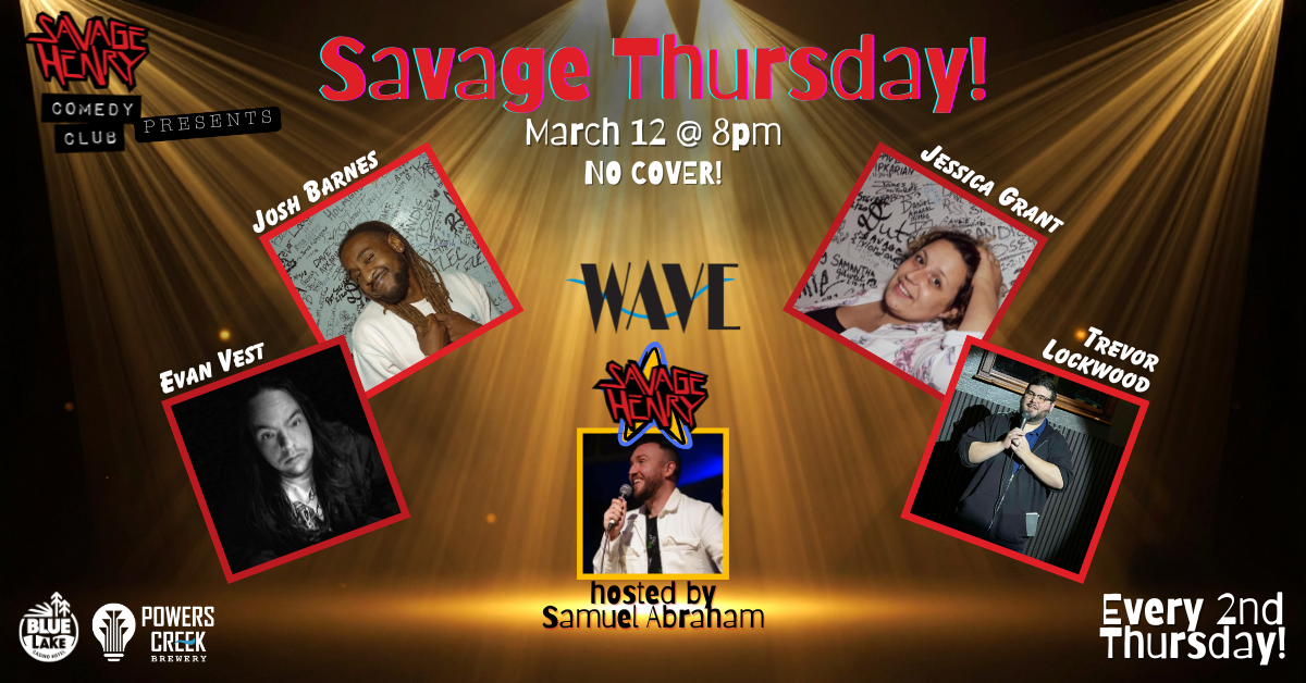 Savage Henry Comedy Club and host Samuel Abraham will bring you some of Humboldt’s best comedians on the second Thursday of each month! For their first performance in March, Samuel is bringing Evan Vest, Trevor Lockwood, Jessica Grant, and Josh Barnes to the Lounge. Come early, get a seat, enjoy a drink from the bar, and get ready to laugh your face off.