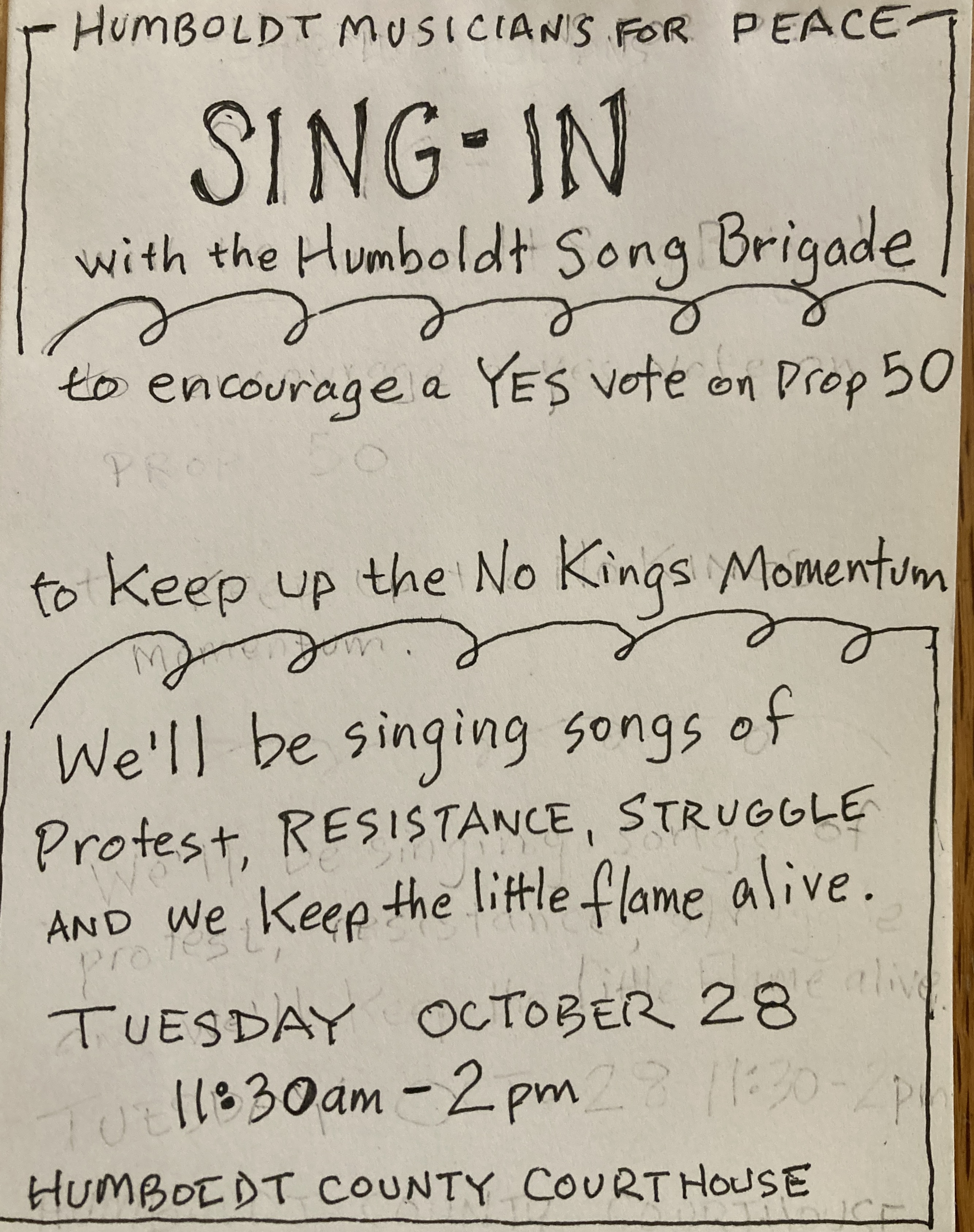 The Humboldt Musicians for Peace and the Humboldt Song Brigade will be singing to encourage a YES vote on proposition 50 on November 4, 2025. All First Amendment exercisers and lovers of singing are welcome to participate too.