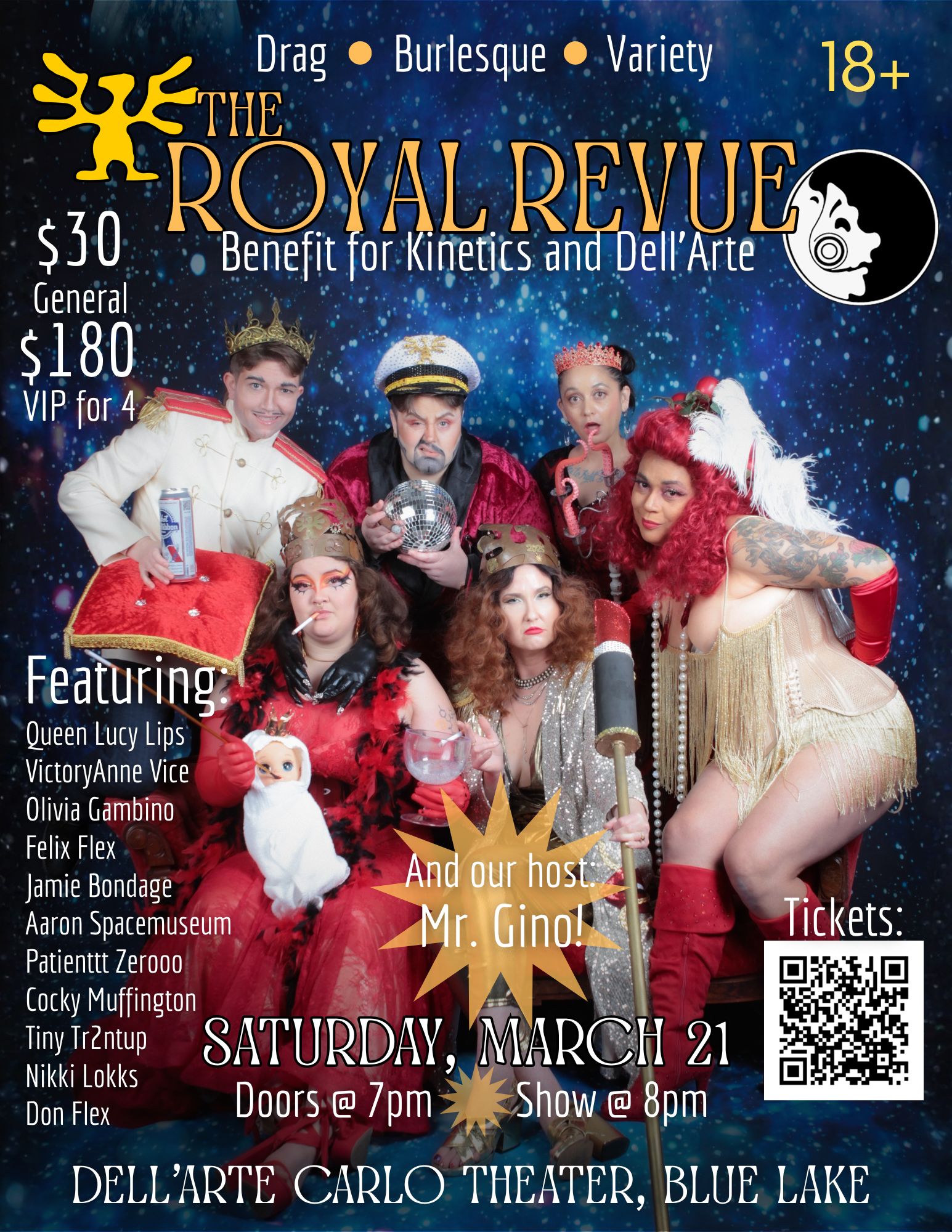 The Kinetic Rutabaga Royalty, in partnership with Dell’Arte, are cooking up something exciting – our first-ever Royal Revue! This one-night-only show features drag, burlesque, and variety performed by our own Rutabaga Queens, Princesses and extended Royal Family!