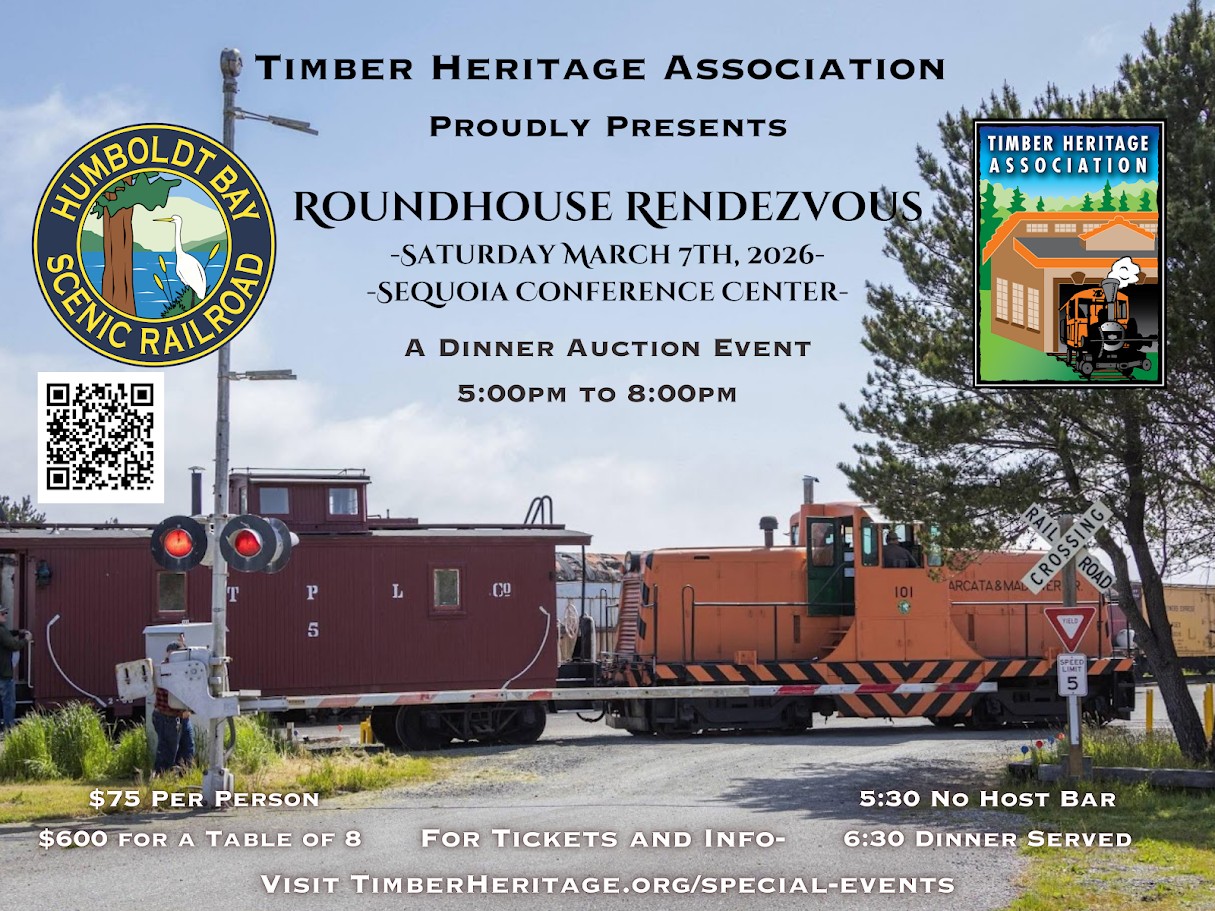 TIMBER HERITAGE ASSOCIATION PROUDLY PRESENTS THEIR ANNUAL ROUNDHOUSE RENDEZOUS ANNUAL DINNER & AUCTION FUNDRAISER. THIS EVENT IS HOW THE TIMBER HERITAGE ASSOCIATION RAISES FUNDS TO DO REPAIRS AND SO FORTH.